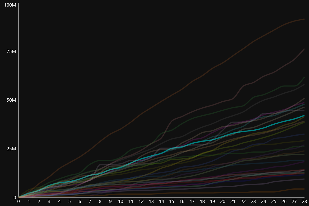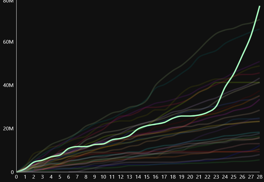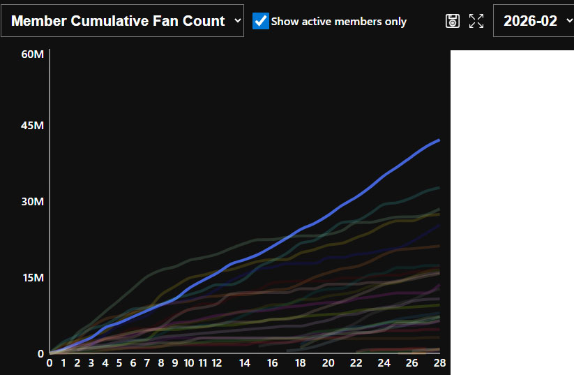 >>558965861188258039584As I answered two days ago, I started to play only on 2026 but I'm active.This is my graph from february - i closed with 42 million fans.I will be in cooldown 'til tomorrow, but if you can send me an invite I'll gladly accept
