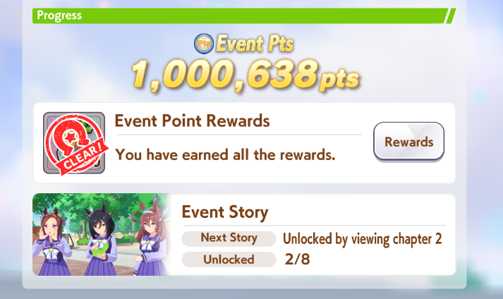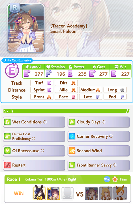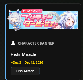 Previous: >>558950112>Global Game NewsLink your account to Cygames iDCurrent Scenario: Aoharu Hai aka "Unity Cup"Current Rate Up Trainee: Mejiro Ardan (3*), Mihono Bourbon (3* alt), Eishin Flash (3* alt)Current Rate Up Support Cards: SSR Agnes Digital (Power), SSR Nishino Flower (Wit), SSR Sakura Bakushin O (Guts), SR Ines Fujin (Wit)Current CM: Aquarius Cup - Tokyo Dirt 1600mMain Story Chapter 5 is out02/18 - 03/01 - Valentine Bourbon & Valentine Flash 3*+Nishino SSR+Bakushin SSR02/18 - 03/01 - The Peak of Confection02/25 - 03/05 - Mejiro Ardan 3*+Agnes Digital SSR02/26 - 03/07 - Legend RacesEarly March - Aquarius Cup - Tokyo Dirt 1600m Left-handed / Winter / Sunny / Firmhttps://umamusume.com/news/100040/https://pages.snep.pw/uma/anni-skill-changes/>JP Game NewsCurrent Rate Up: Almond Eye (3*), SSR Forever Young, SSR Casino DriveNew Scenario "Beyond Dreams" releasedTimeline: https://uma.moe/timelineCygames Webstore: https://webstore.cygames.com/en/umamusume_en/>Thread Clubshttps://rentry.co/umaglobalclublistYou must be E3 (20k points) to join a circle. Apply with /uma/ or /vg/ in your profile or post ID in the thread.>All Guides & Resourceshttps://rentry.org/uma26Game databasehttps://gametora.com/umamusume (Click the gear to switch between JP / global server info)A basic guide for newfagshttps://rentry.org/umaglobalFind networks if your region is blocked from the game or clienthttps://www.umavpn.top/93Seiyuu & Concertshttps://rentry.org/umstUmamusume Birthday Calendarhttps://ウマ娘.攻略.tools/events/birthdayUma Texthttps://umareader.idsmile.xyz/