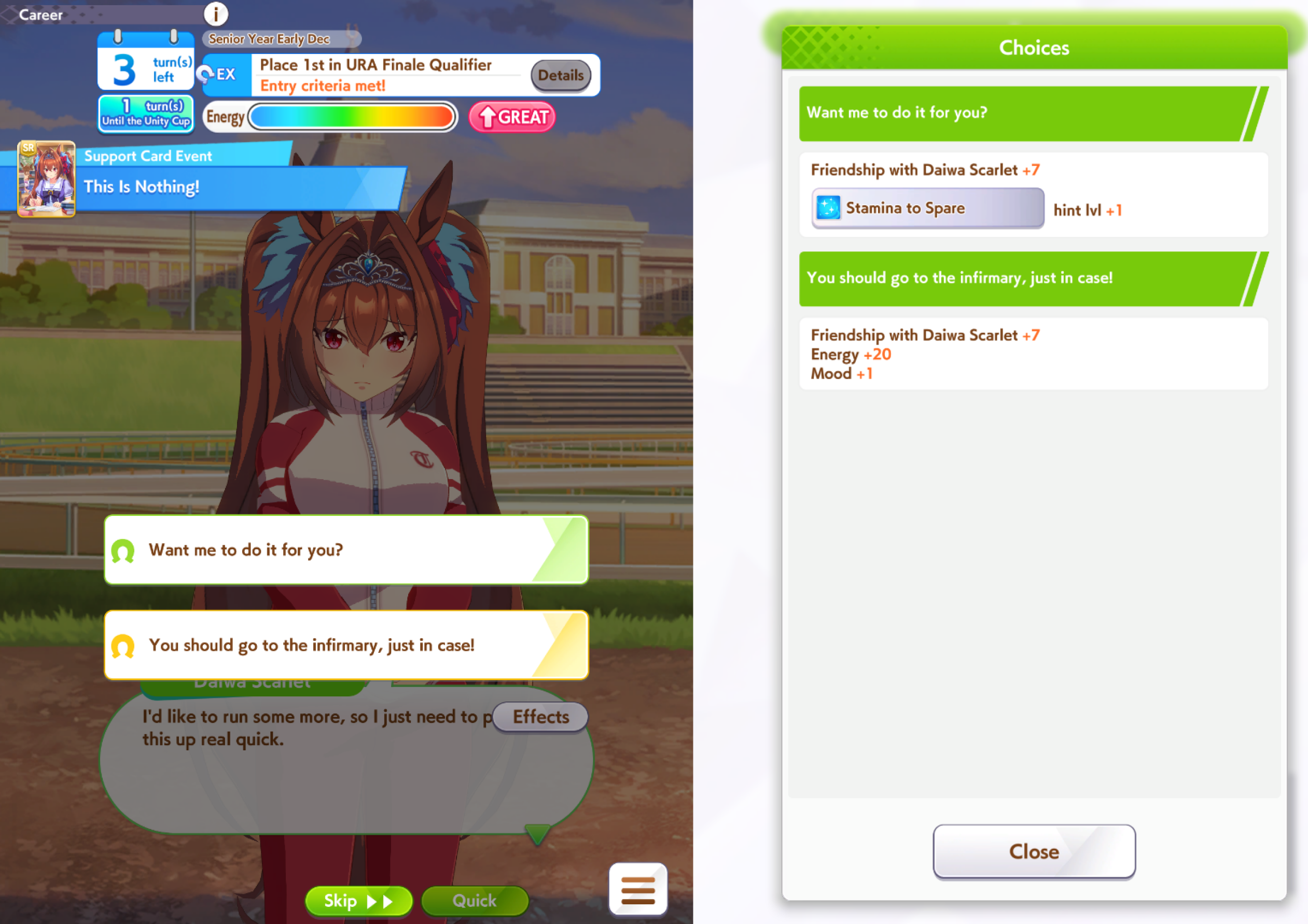 So URA final turn. I can go for a rainbow guts training with 1 riko and 2 support cards that will let me cap speed and +31 guts +8 skill pointsORI can go for a power with 2 support cards + 1 blue chevron pop that will let me reach 601 stamina and 1k power BUT uncapped speed of 1189 and only +3 skill pointsWhich way to go /uma/?