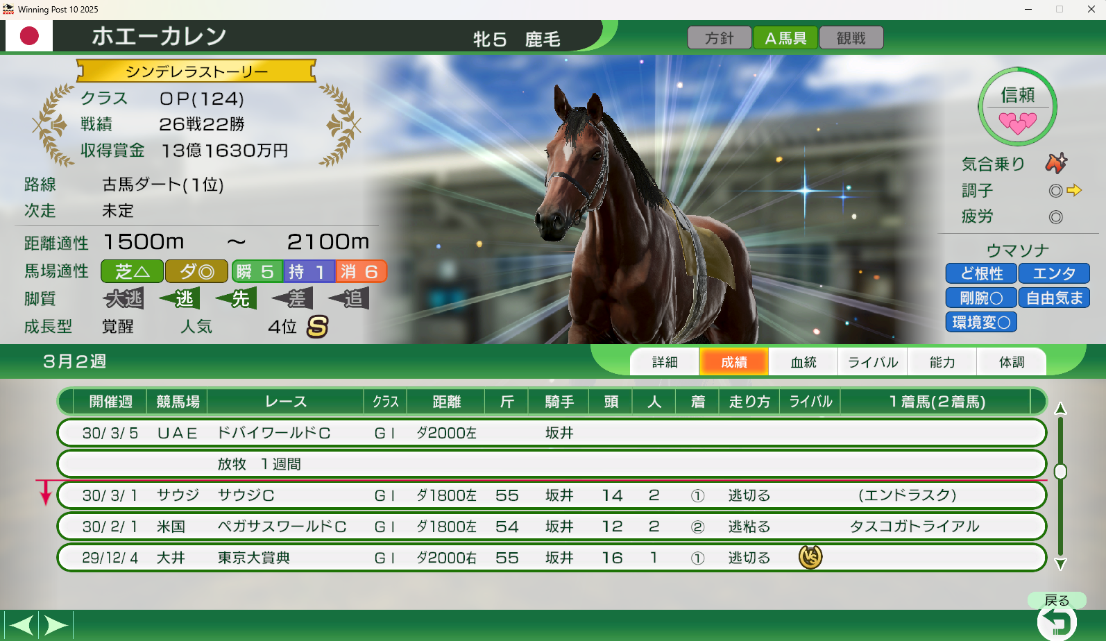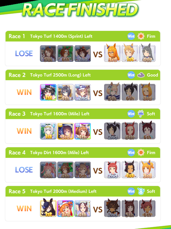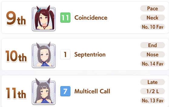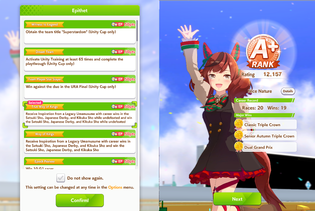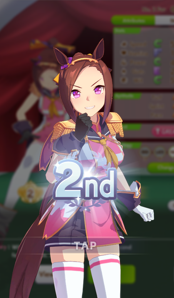 >>558966525relatable... I got fucked on Tenno Spring. Had the stats by a mile but got pulled back by some torpedos and wasn't able to recover.Nice Nature was my first Way of Kings back in URA and now she's my first True Way of Kings. I also didn't realize that you only had to be undefeated up until the kikka sho. I thought you had to stay undefeated your whole career, yet here we are.