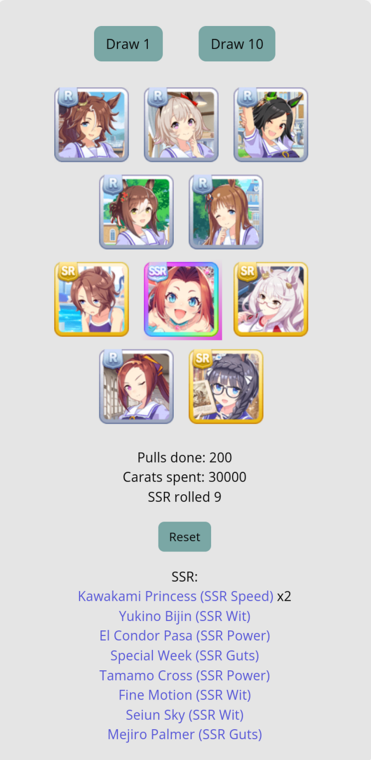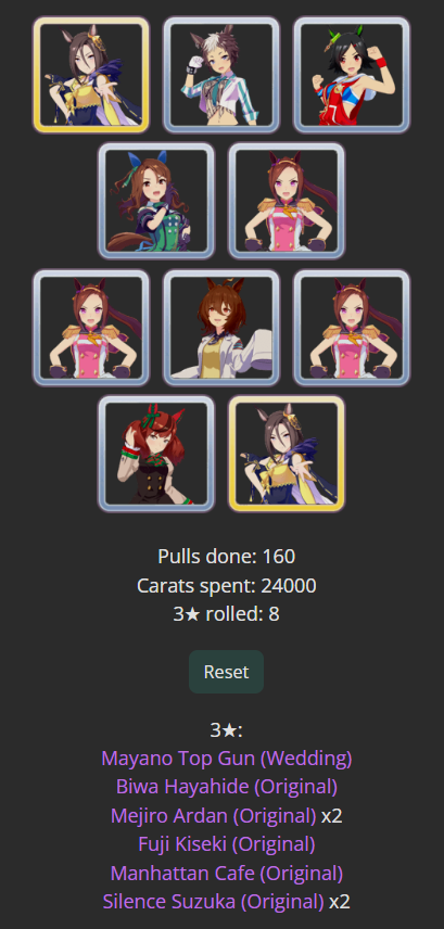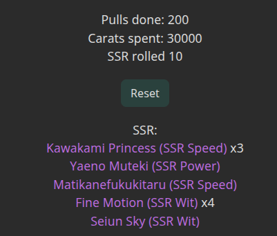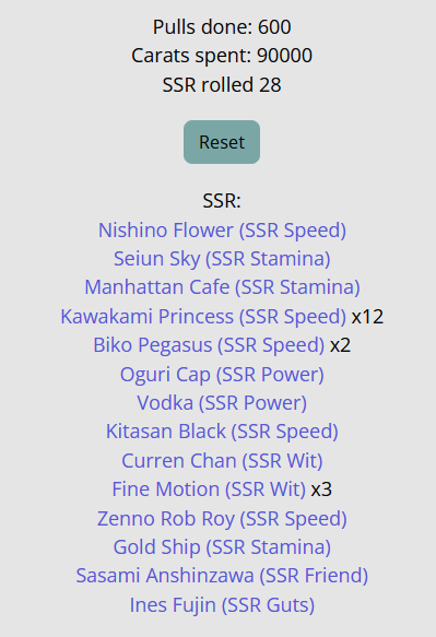 When I rolled on kitasan black i dumped 220 and i got 1 kitasan and 1 yaeno muteki and that was it. Never felt so raped