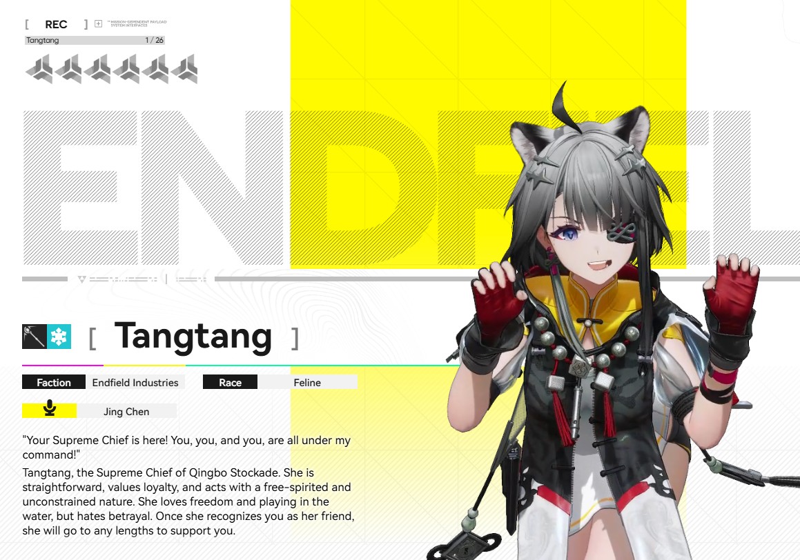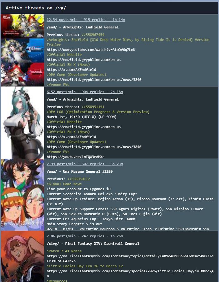 Previous thread: >>558967454>Arknights: Endfield [Old Deep Water Dies, by Rising Tide It is Denied] Version Trailerhttps://www.youtube.com/watch?v=AtoOV6q7LnU>Official Websitehttps://endfield.gryphline.com/en-us>Official EN X (News)https://x.com/AKEndfield>DEV Comm (Developer Updates)https://endfield.gryphline.com/en-us/news/3846>Yvonne PVshttps://youtu.be/1mTQW3rAMXchttps://youtu.be/rDmr6zDPEawhttps://youtu.be/xqSHlK8kAKI>Chartered Headhunting ScheduleFebruary 24th to March 13th --- "Hues of Passion", (Yvonne)>Reward CodesENDFIELDGIFTENDFIELD4PC>Twitch Dropshttps://endfield.gryphline.com/special/third-party-binding?channel=twitch>Voyage to the Stars (Ongoing until March 4th)https://endfield.gryphline.com/activity/voyage-to-the-stars/en-us/>Wikishttps://wiki.skport.com/endfield (Official)https://perlica.moehttps://warfarin.wiki/enhttps://endfield.wiki.gg/>Blueprint Guideshttps://talospioneers.com/en>Stickershttps://drive.google.com/drive/folders/13KH3L6QPIKkVH7pBddv4uxwmwJsnOtklhttps://drive.google.com/drive/folders/1OuVtjv1k-9c3M6n7d4PX3CGG5bkwH04ahttps://drive.google.com/drive/folders/1AStB8bzFk3lSwMwczWPkFYCBrZe0vHOghttps://drive.google.com/drive/folders/1yS0lqUhxf8tBRtpDFfCU1y16IS2sSeF7>Fr/end/sSubmit your info, /end/min:https://forms.gle/Fo7BhZMKaKqiWyL19View other /end/mins:https://docs.google.com/spreadsheets/d/1YtxiDss0hgEQhLlZgpfzyGrJrzUcqDzOS9T6IH-BiVc/edit?usp=sharing