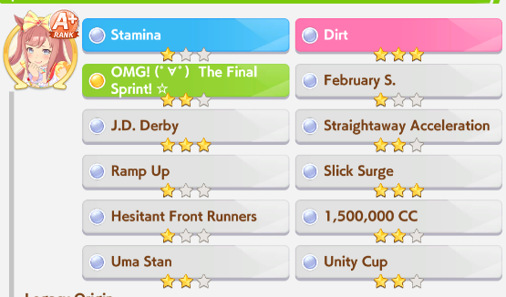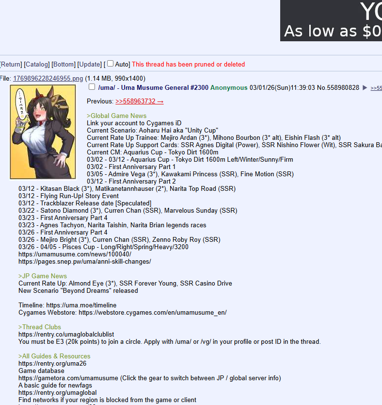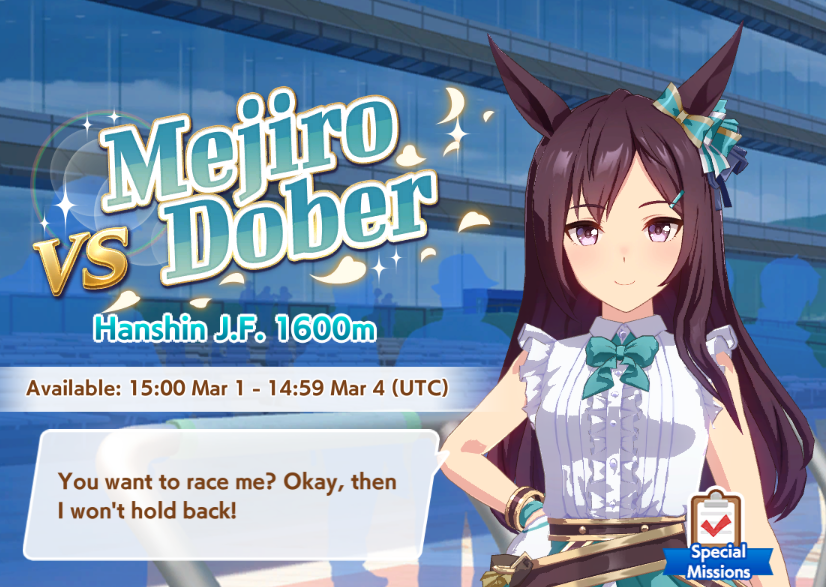 Spring Sunday editionPrevious: >>558963732>Global Game NewsLink your account to Cygames iDCurrent Scenario: Aoharu Hai aka "Unity Cup"Current Rate Up Trainee: Mejiro Ardan (3*), Mihono Bourbon (3* alt), Eishin Flash (3* alt)Current Rate Up Support Cards: SSR Agnes Digital (Power), SSR Nishino Flower (Wit), SSR Sakura Bakushin O (Guts), SR Ines Fujin (Wit)Current CM: Aquarius Cup - Tokyo Dirt 1600mMain Story Chapter 5 is out02/18 - 03/01 - Valentine Bourbon & Valentine Flash 3*+Nishino SSR+Bakushin SSR02/18 - 03/01 - The Peak of Confection02/25 - 03/05 - Mejiro Ardan 3*+Agnes Digital SSR02/26 - 03/07 - Legend RacesEarly March - Aquarius Cup - Tokyo Dirt 1600m Left-handed / Winter / Sunny / Firmhttps://umamusume.com/news/100040/https://pages.snep.pw/uma/anni-skill-changes/>JP Game NewsCurrent Rate Up: Almond Eye (3*), SSR Forever Young, SSR Casino DriveNew Scenario "Beyond Dreams" releasedTimeline: https://uma.moe/timelineCygames Webstore: https://webstore.cygames.com/en/umamusume_en/>Thread Clubshttps://rentry.co/umaglobalclublistYou must be E3 (20k points) to join a circle. Apply with /uma/ or /vg/ in your profile or post ID in the thread.>All Guides & Resourceshttps://rentry.org/uma26Game databasehttps://gametora.com/umamusume (Click the gear to switch between JP / global server info)A basic guide for newfagshttps://rentry.org/umaglobalFind networks if your region is blocked from the game or clienthttps://www.umavpn.top/93Seiyuu & Concertshttps://rentry.org/umstUmamusume Birthday Calendarhttps://ウマ娘.攻略.tools/events/birthdayUma Texthttps://umareader.idsmile.xyz/