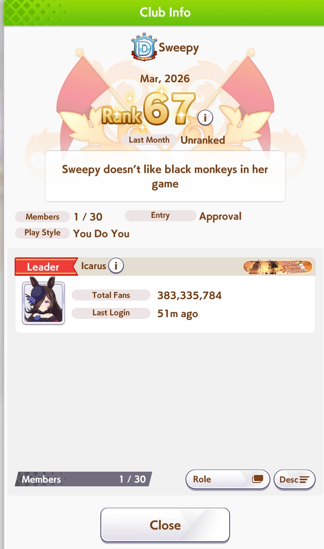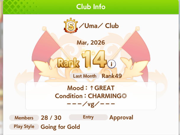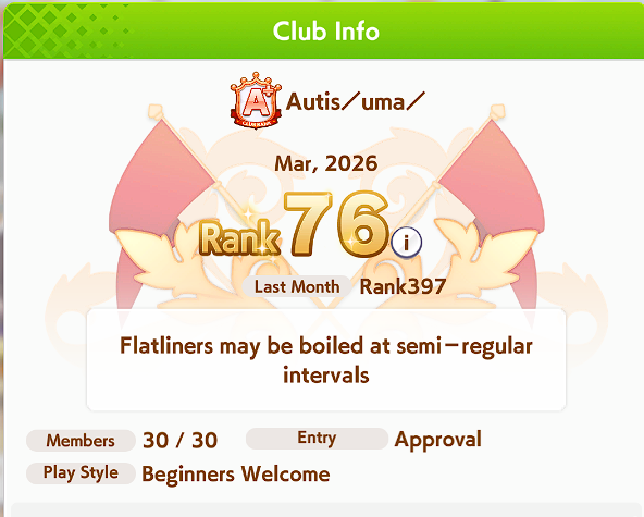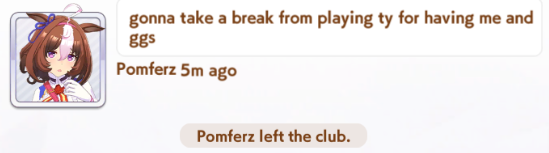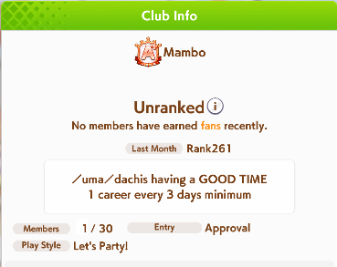 Dacchis has a couple free slots open for any ojisans looking for a club.A+ club, quota is at 20 mil. Chill and friendly anons in chat!Don't flatline for too long without giving a heads up.Just drop your id here for an invite or apply ingame. Have /uma/ in your profile.Even if you are on cooldown we can still send an invite.