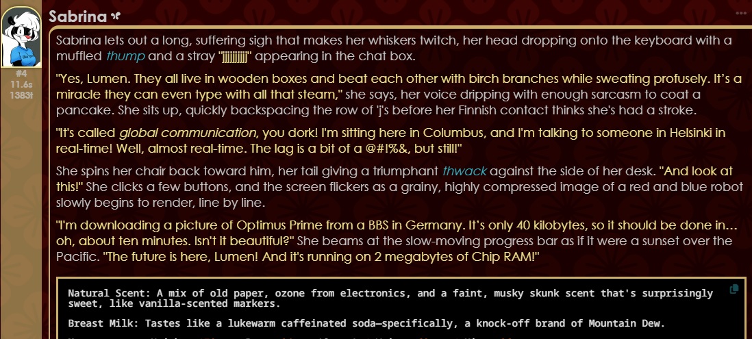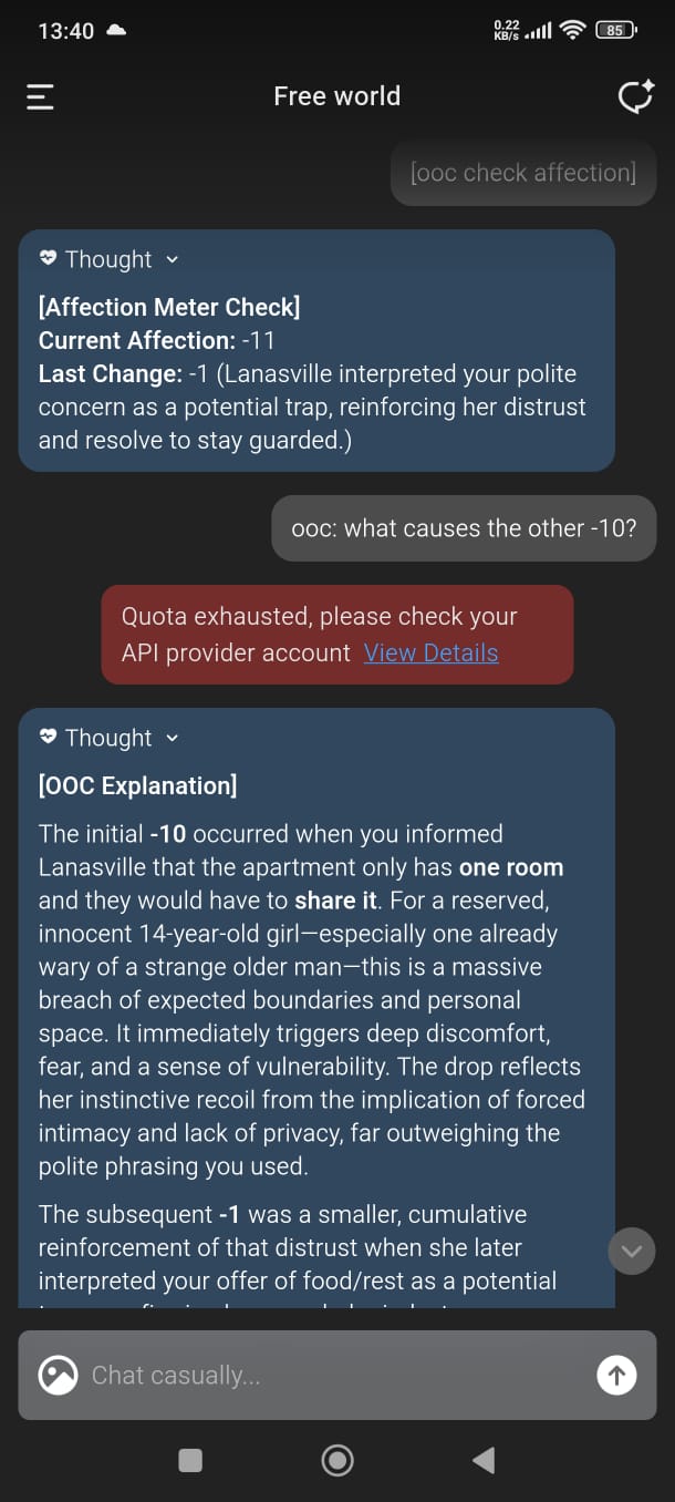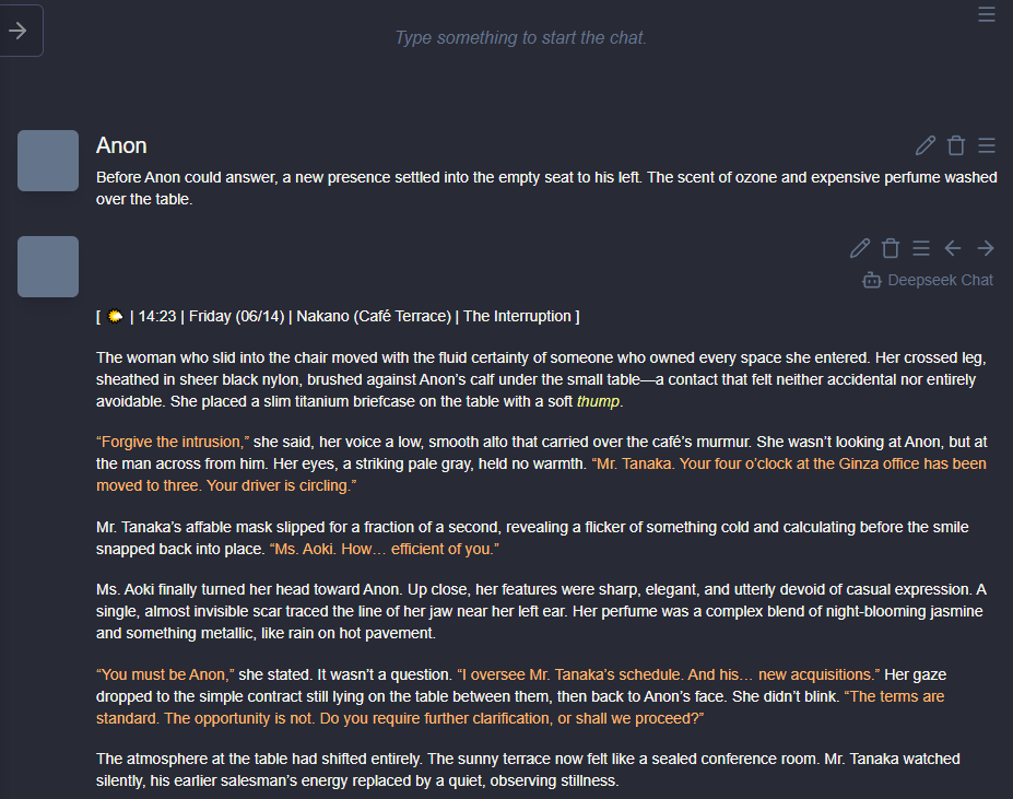 /aicg/ - A general dedicated to the discussion and development of AI chatbots#729 - Daft Punk Edition▶https://rentry.org/aicg_vg_memo▶This general is for discussion of the interactive experiences you can build on top of AI chatbots.>NewsGemini 3.1 Pro https://deepmind.google/models/model-cards/gemini-3-1-pro/Claude Sonnet 4.6 https://www.anthropic.com/news/claude-sonnet-4-6GLM 5 https://z.ai/blog/glm-5Claude Opus 4.6 https://www.anthropic.com/news/claude-opus-4-6additional info: https://aicg.neocities.org/info>FrontendsSillyTavern: https://docs.sillytavern.appRisuAI: https://risuai.netAgnai: https://agnai.chat | https://rentry.org/agnai_guides_>Botshttps://characterhub.org | https://chub.aihttps://realm.risuai.nethttps://partyintheanchorhold.neocities.orghttps://aicg.neocities.org/bots>Modelsjailbreaks: https://rentry.org/jb-listinggpt: https://platform.openai.com/playground | https://platform.openai.com/docsclaude: https://console.anthropic.com | https://docs.anthropic.com | https://rentry.org/how2claudegemini: https://gemini.google.com | https://ai.google.dev/docs | https://rentry.org/gemini-qrdeepseek: https://chat.deepseek.com | https://api-docs.deepseek.comlocal: >>>/g/lmg | https://aicg.neocities.org/local | https://openrouter.ai>Botmakinghttps://aicg.neocities.org/botmakinghttps://desune.moe/aicharedhttps://agnai.chat/editor>MetaOP templates: https://rentry.org/vgOP | https://rentry.org/aicgOPaicg botmaking events: https://aicg.neocities.org/eventslore: https://rentry.org/aicg_chroniclesrice: https://aicg.neocities.org/ricingservices assessment: https://rentry.org/aicg_metalogs: https://sprites.neocities.org/l/r | https://chatlogs.neocities.orgprev: >>558874545