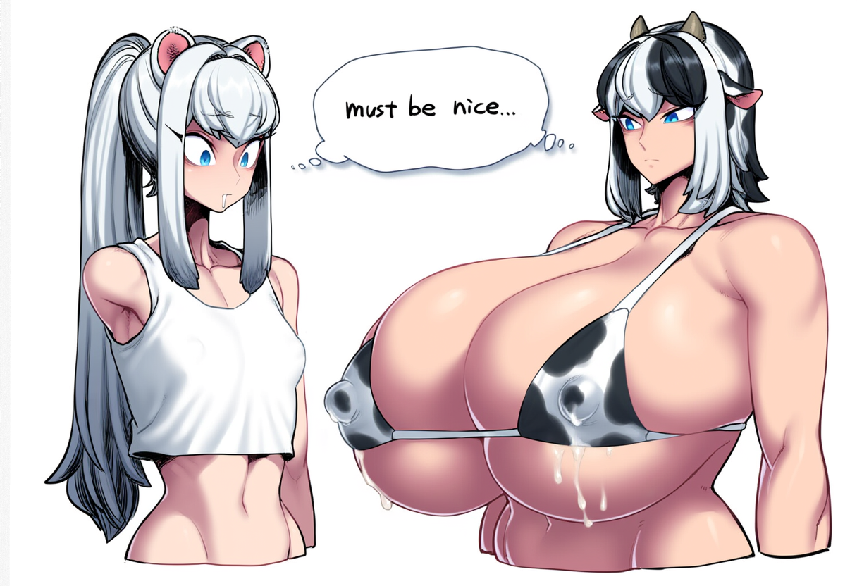 >>5590938791girl, huge breasts, cow print bikini