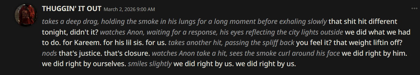 >>559091062*watches you take a hit, nods* good shit. *takes the spliff* we earned this. *takes a hit, and exhales slowly* we did good tonight. *passes it back to you*