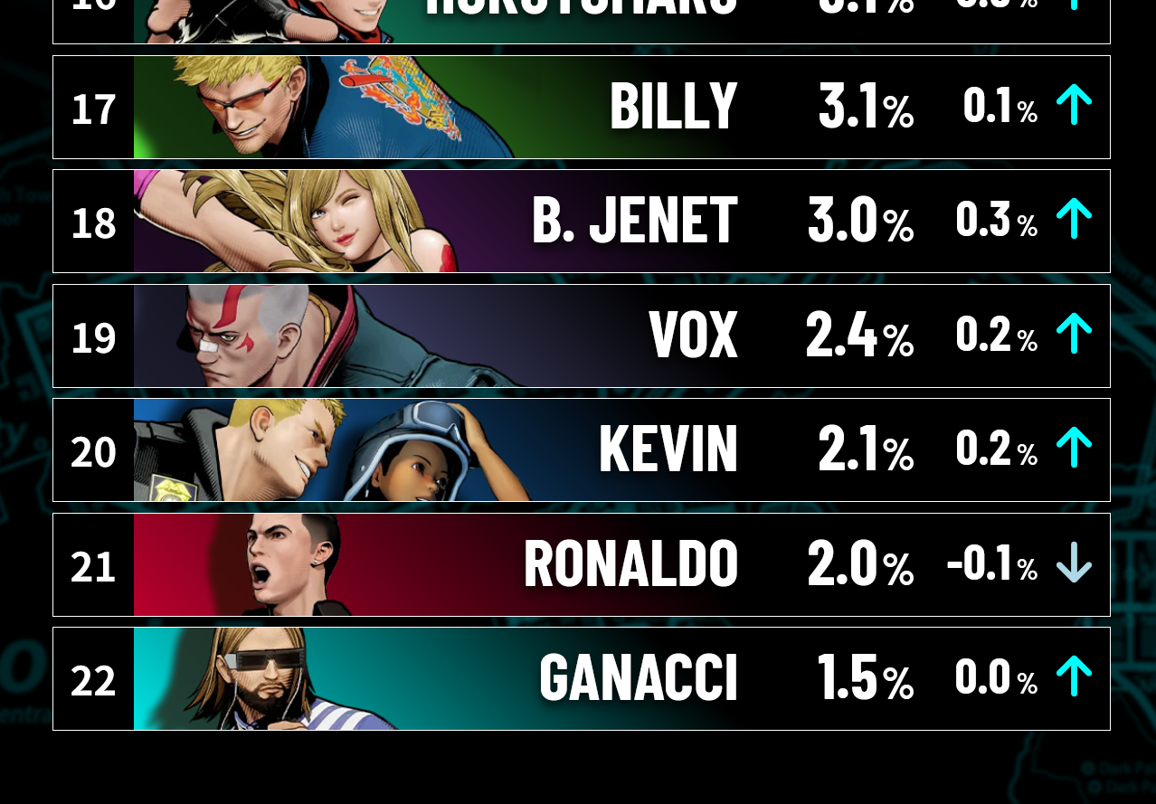 https://snk-corp.co.jp/official/fatalfury-cotw/usagerate/group_total/usage-t.phpCan't think of a worse addition to a Fighting Game than these guys. Absolutely no-one likes nor plays Ball-Kick Man, and DJ Literally Who. Angered the fans and snubbed characters people actually wanted for nothing.