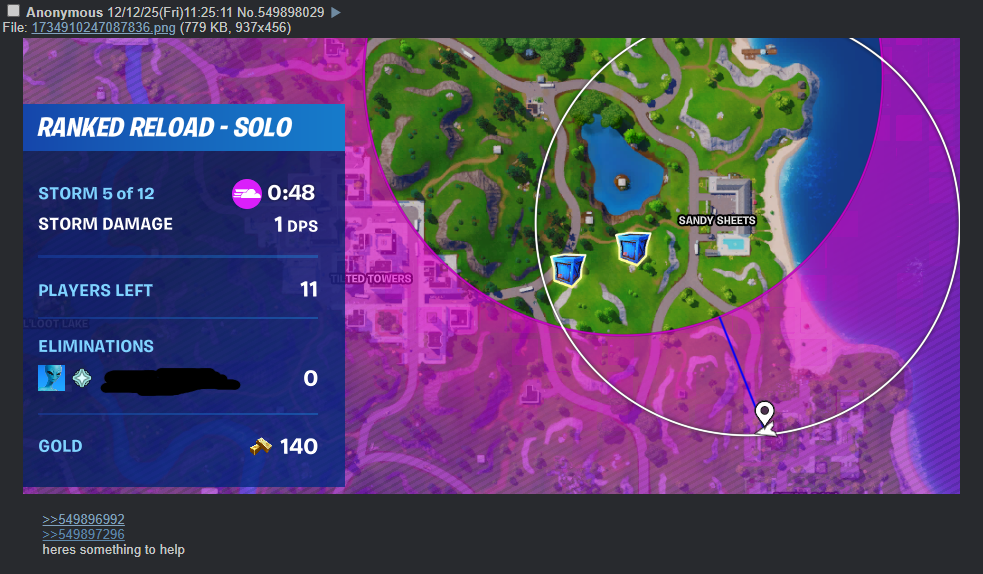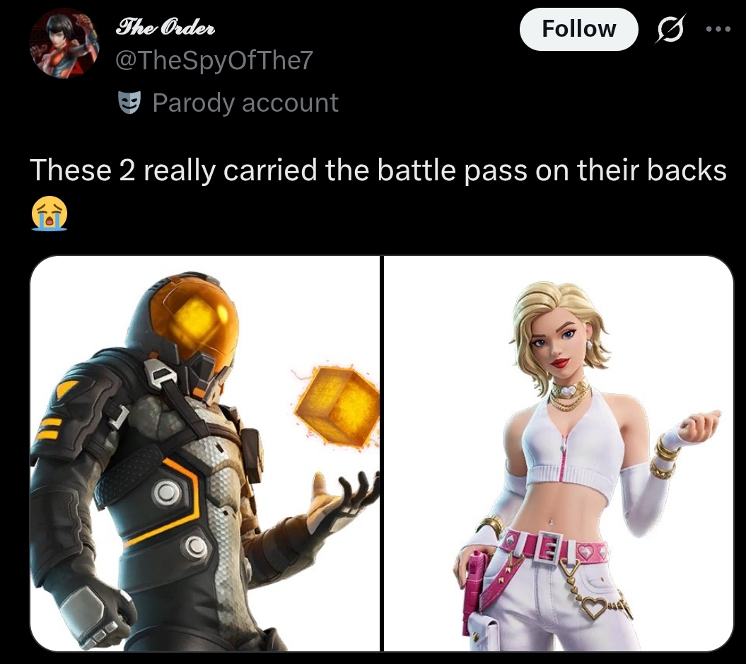 >>559016674for the last time you're not a sweat you're just slighty above average, a sweat is someone that only plays the exact same way every single time and that way is probably some streamer's strategy because all he cares about is winning, even during an event, even the day they added a new thing, they just care about the absolutely best strategy that'll make them win with the least amount of effort possible even if it means sitting on your ass for minutes doing nothingthe issue is fortnite is a dogshit competitive game, this is the game where aiming is considered skillful and not the bare minimum to play a shooter, absolutely no one cares you can crank 90's anymore and if you don't play builds even worse because you can't even play tournaments so being a sweat is actually subhuman at that point