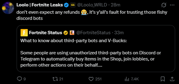 >>559156951>The Xbox refund exploit (or "scam") in Fortnite began in December 2024 and continued through July 2025. During this period, a system malfunction on Xbox allowed players to receive refunds for purchases while keeping the V-Bucks and items, prompting Epic Games to revoke items from accounts with 7 or more abuse-related refunds.Wrong one Lol.
