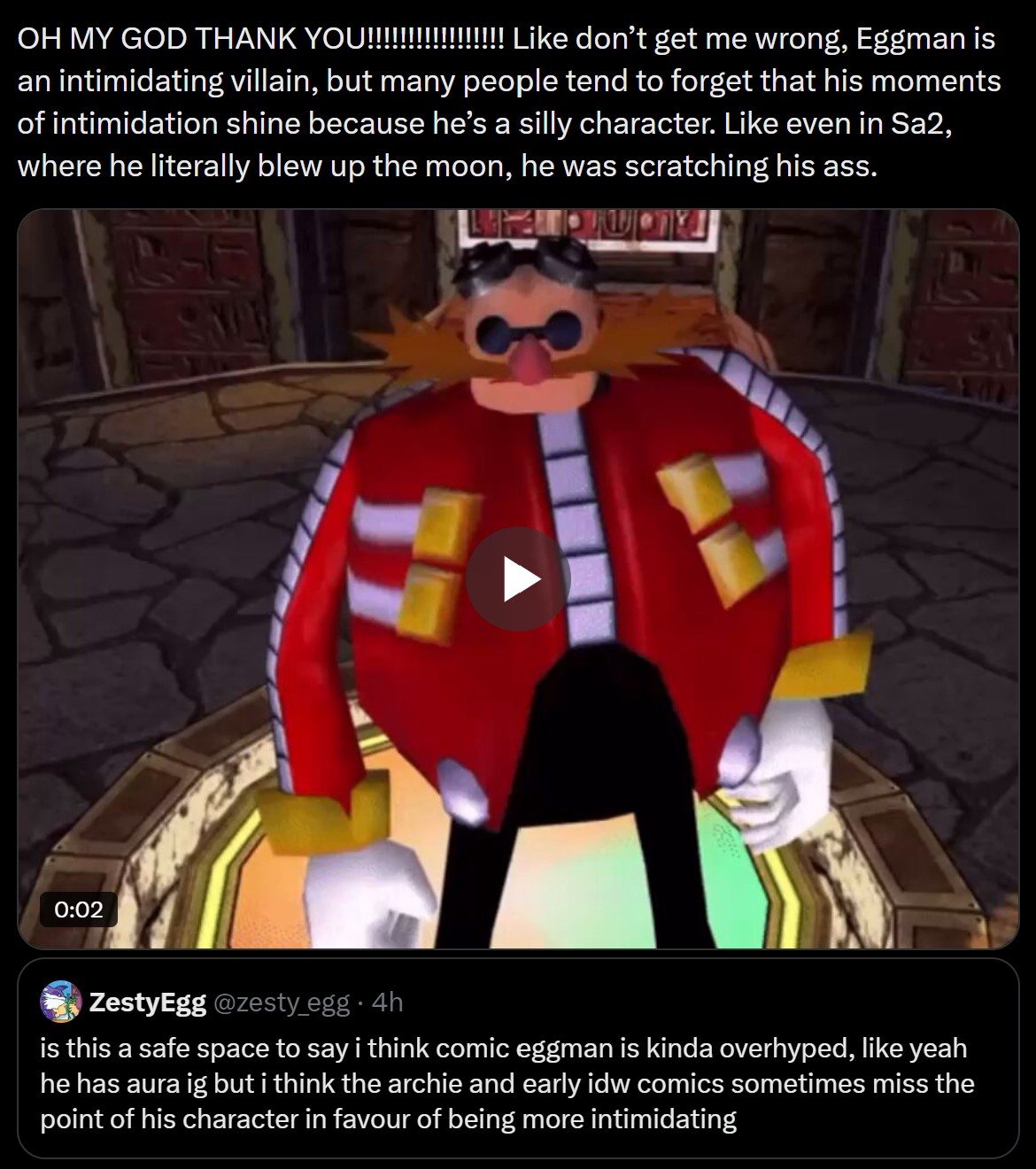 >>559032043>Gamma was most likely winning in his encounter with Sonic>>558984153>>558985753Sonic the Fraudhog>>558990476E-102 Gamma was truly lightning in a bottle, E-123 Omega is pretty close but he had a synthetic energy source instead of an organic battery so the comparison isn't fair.>Gamma, despite the odds, beat not only the spec-superior E-101 (pre- and post-remodel) but also E-103 thru E-105>Gamma's warped robotic lyrics, "it's my pleasure; ready to die" as well as his foreshadowing when he looked at his hand and the recurring static bird memory strongly imply that he chose to self-destruct to free the life within him>Gamma is canonically STILL ALIVE in Maginaryworld because his robot "soul" was THAT special>Eggman may not have realized exactly what made Gamma "tick" so his initial solution to making another Gamma was to make a cheap mass-produced version of him, which is visually more like Beta with a paintjob and functionally a grounded EggRobo>that failed, so a costlier E-123 was presumably made later to safeguard his most prized treasure (Shadow) but his AI was made too well too and he grew to resent Eggman for what he felt like was undervaluing him>he rebelled, so Eggman made E-102 Chaos Gamma (it's unclear if this is the actual Gamma remade since Rouge's account is an unverified theoretical) which fared better as an enforcer that partially mimicked chaos energy and was mass-produced too for easy money (Guard Robos) but still jobbed, unknown what happened to him after Battle but he may have just been the Gamma that was supposed to be in Heroes before it was finalized as OmegaHonestly if Eggman gave Gamma his A-game when he built him and didn't use a random captured animal, Gamma could've probably done what Omega couldn't and blown Eggman's head off a long time ago.