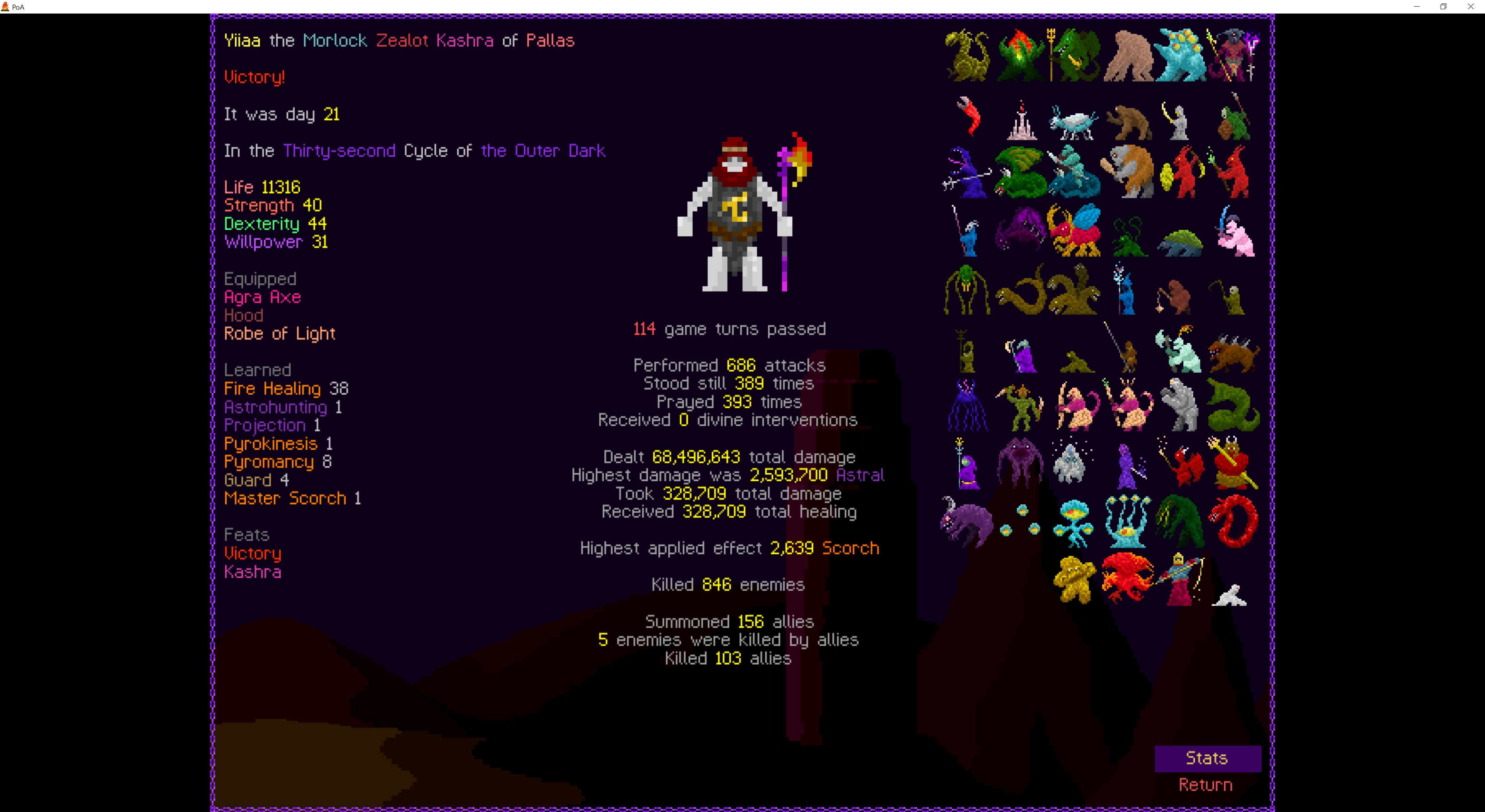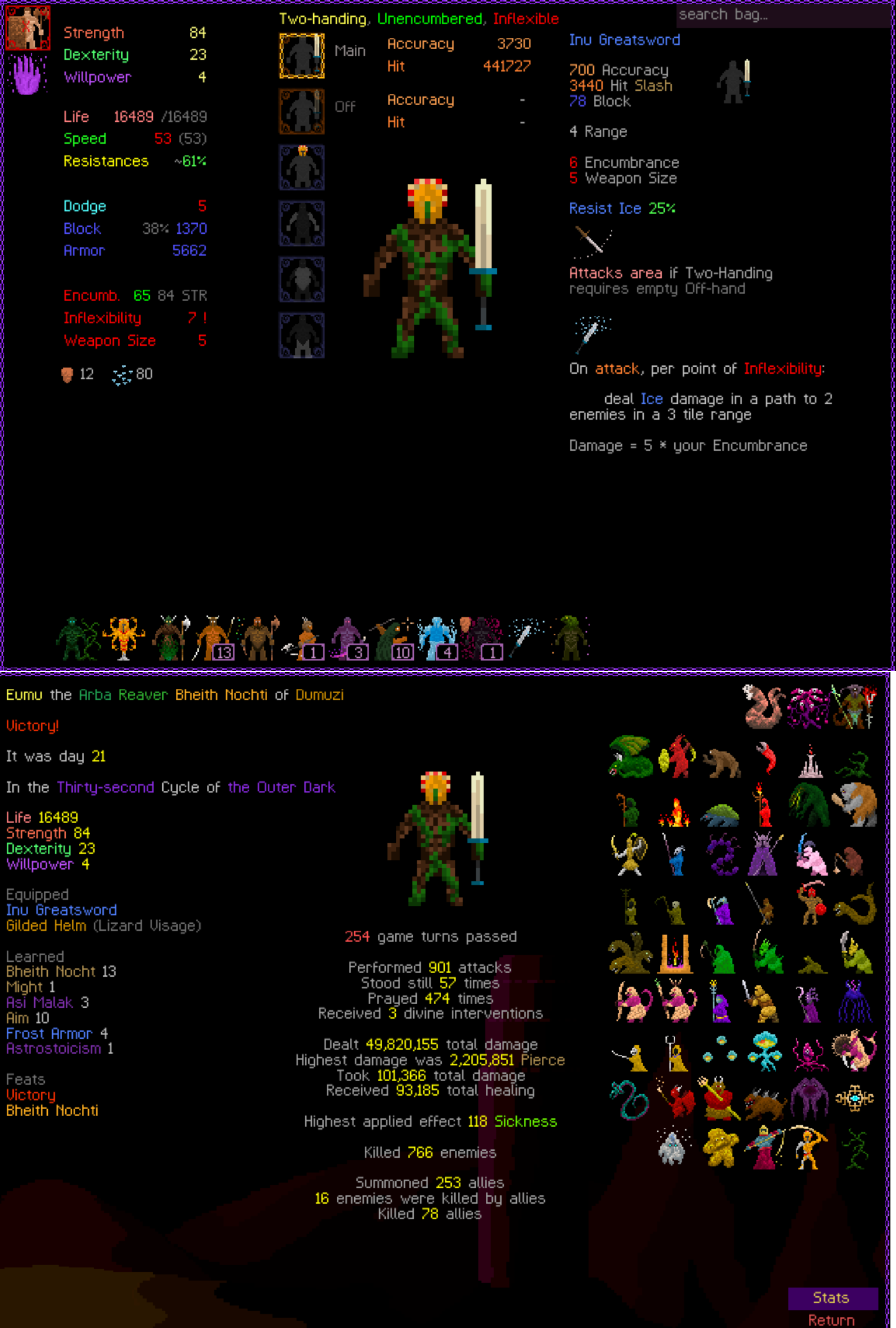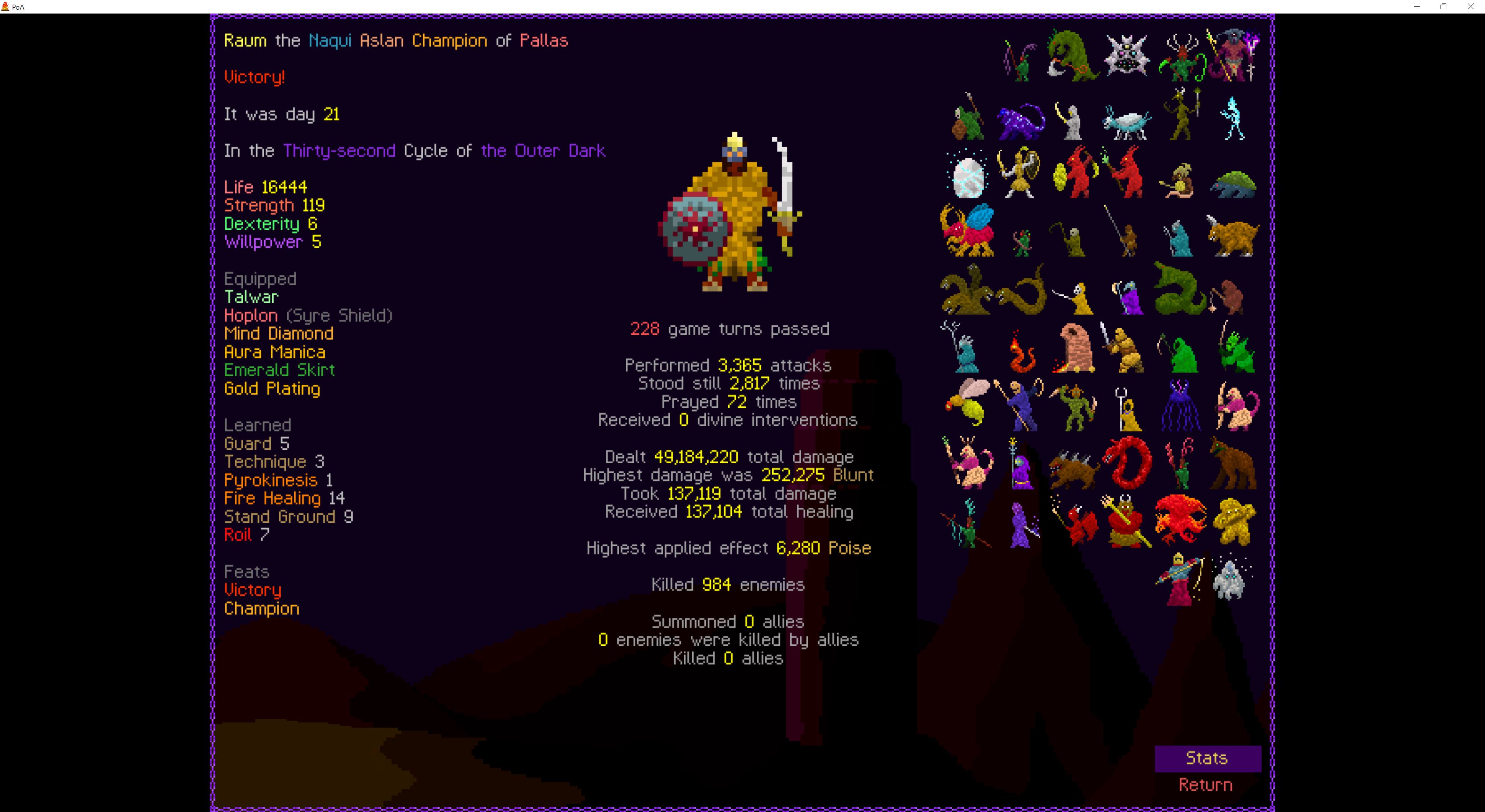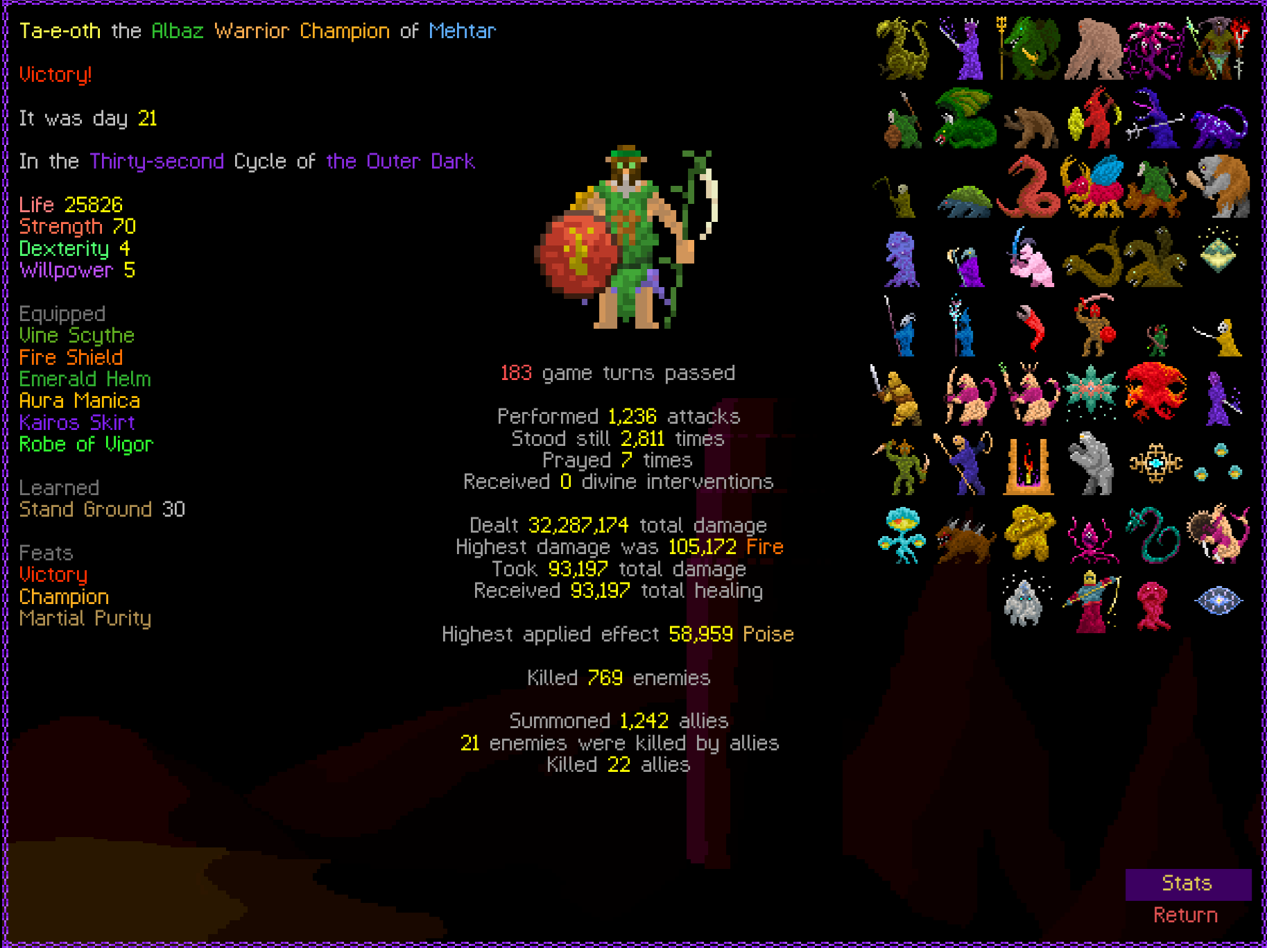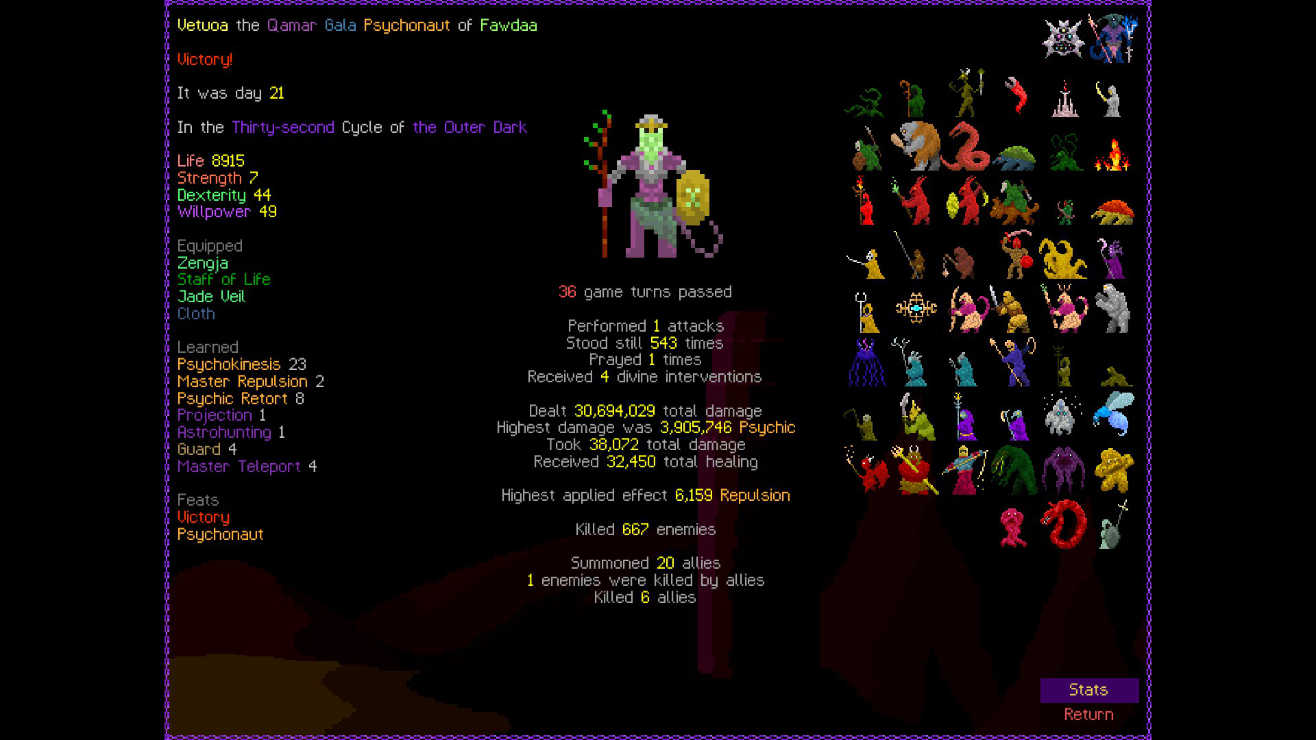 So it ended up being perhaps a bit more generic than I liked. I was trying to get cute and figure out a way to make Myrmidon viable because of that sexy shield she has, but it ended up being too painful and clunky. Also I gotta say WTF is that damage? That was the quickest final boss fight I've seen on cycle 32. 6000 repulsion, Jade Veil, and loincloth is really enough to dome him like that? My last fucking run took like 45k charge to finally finish him off.