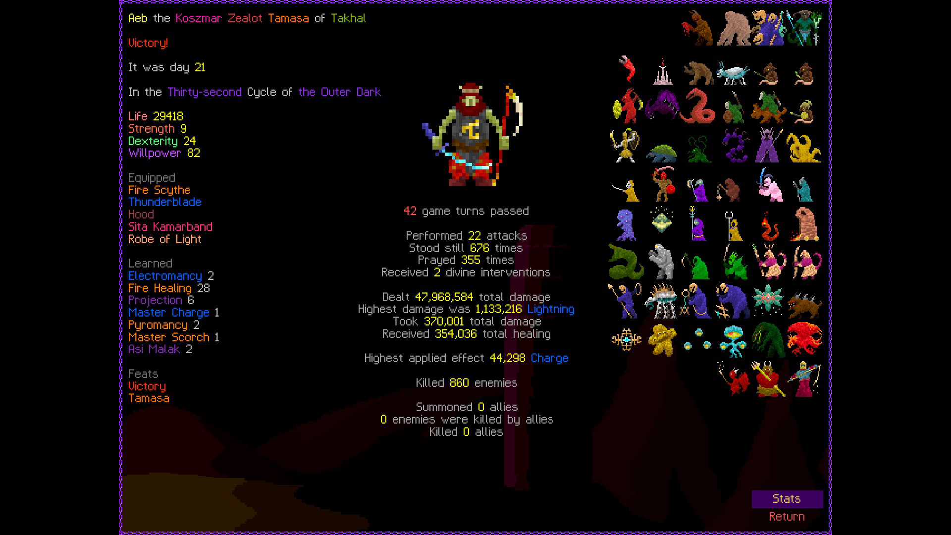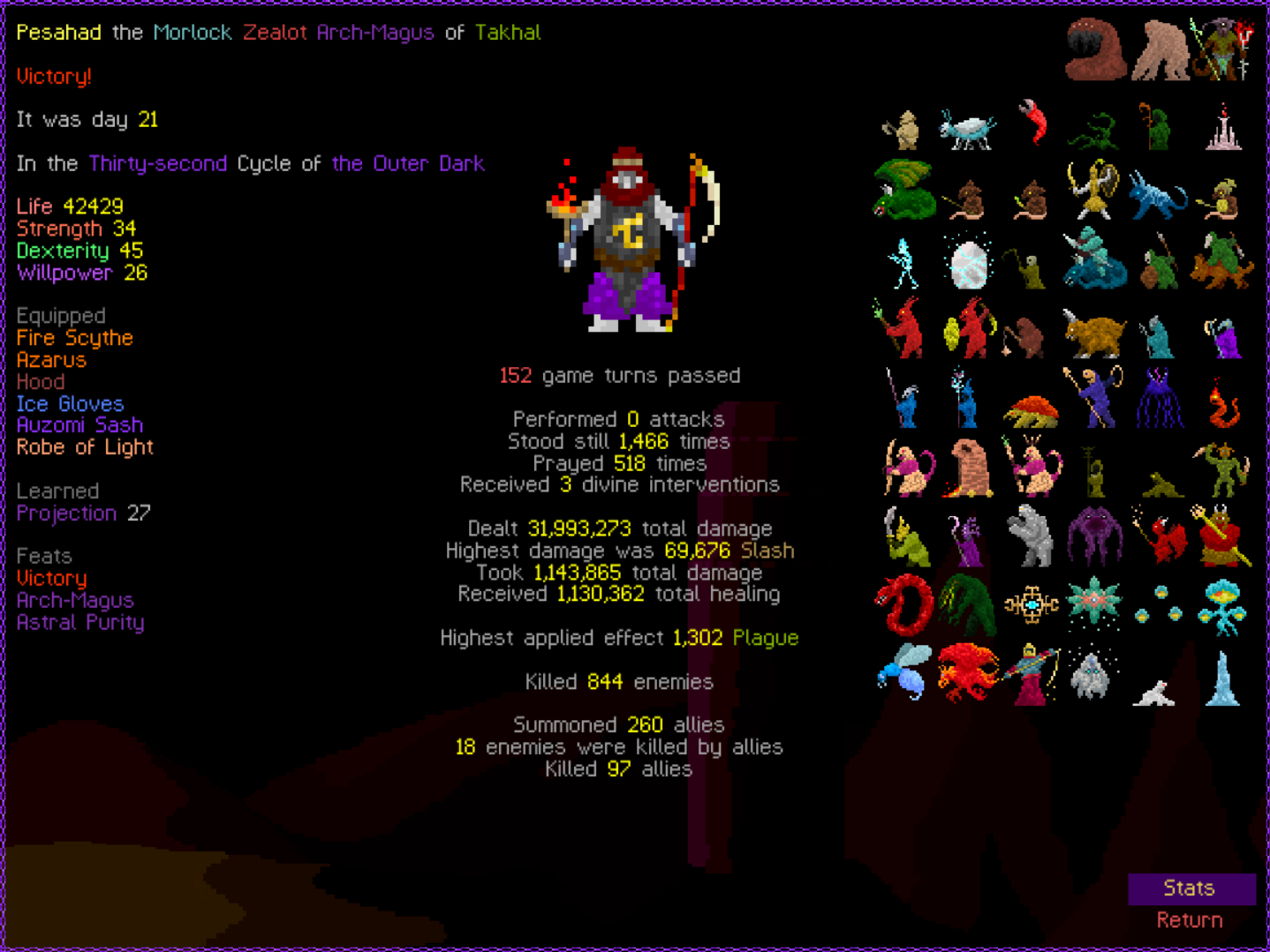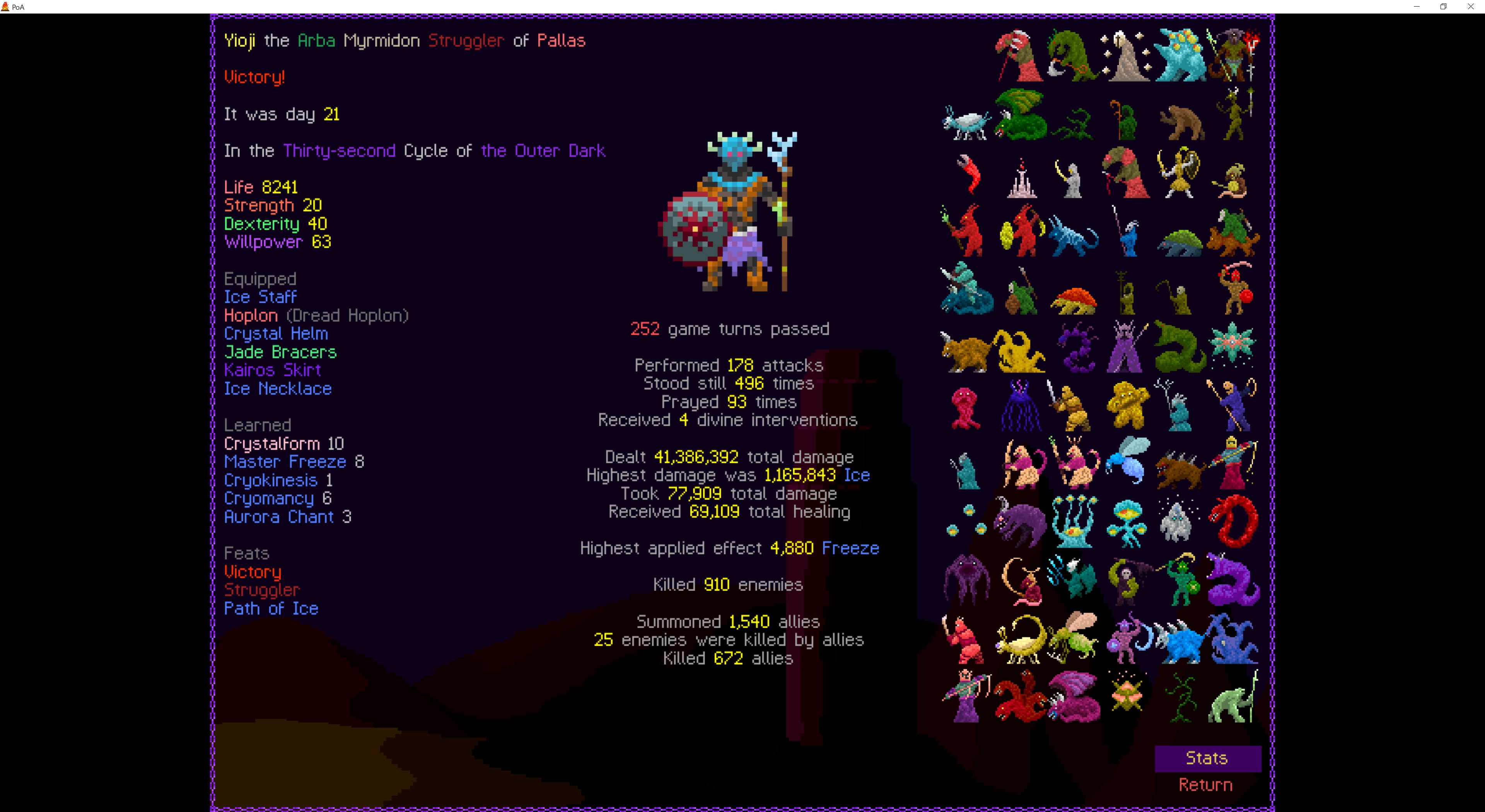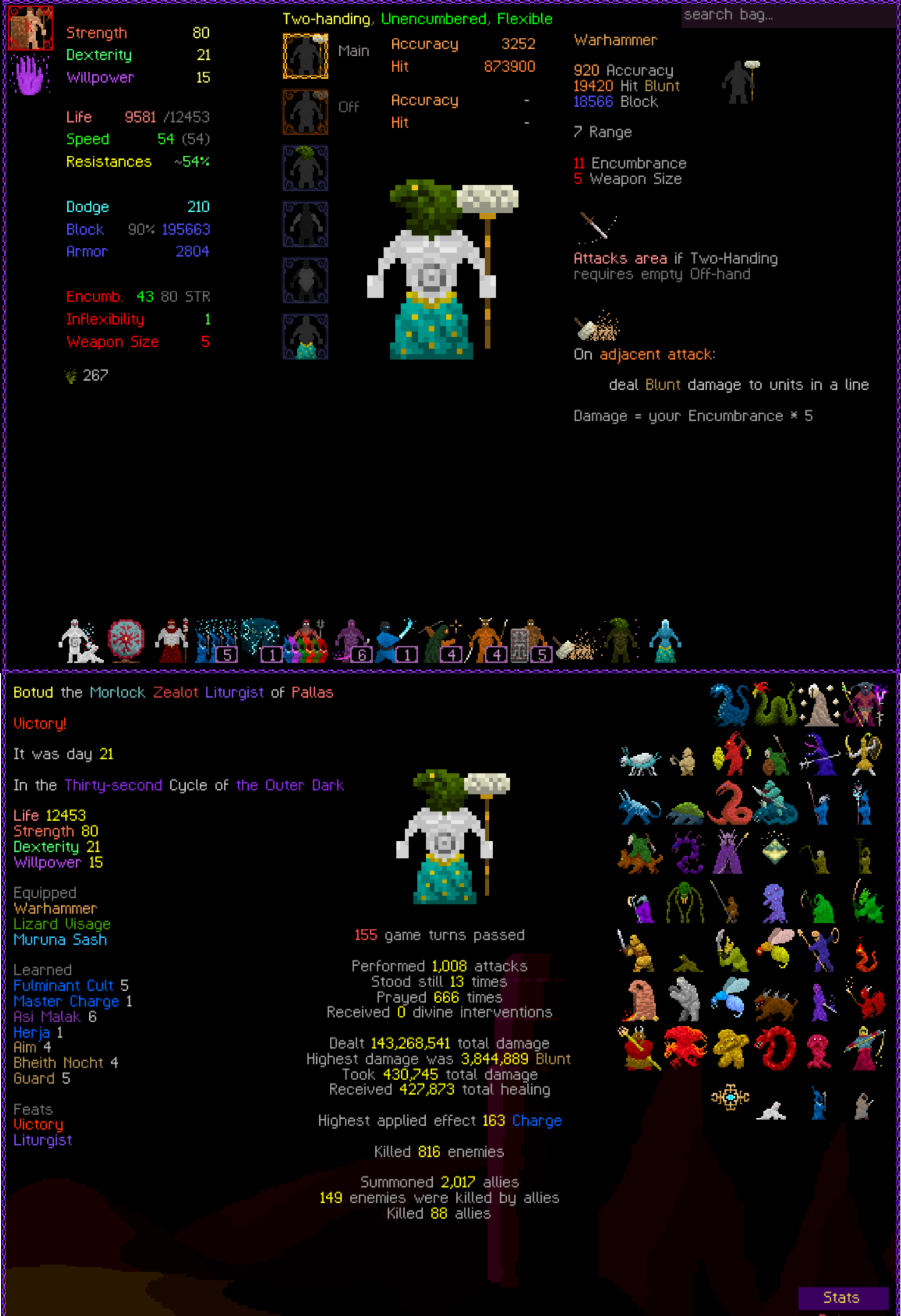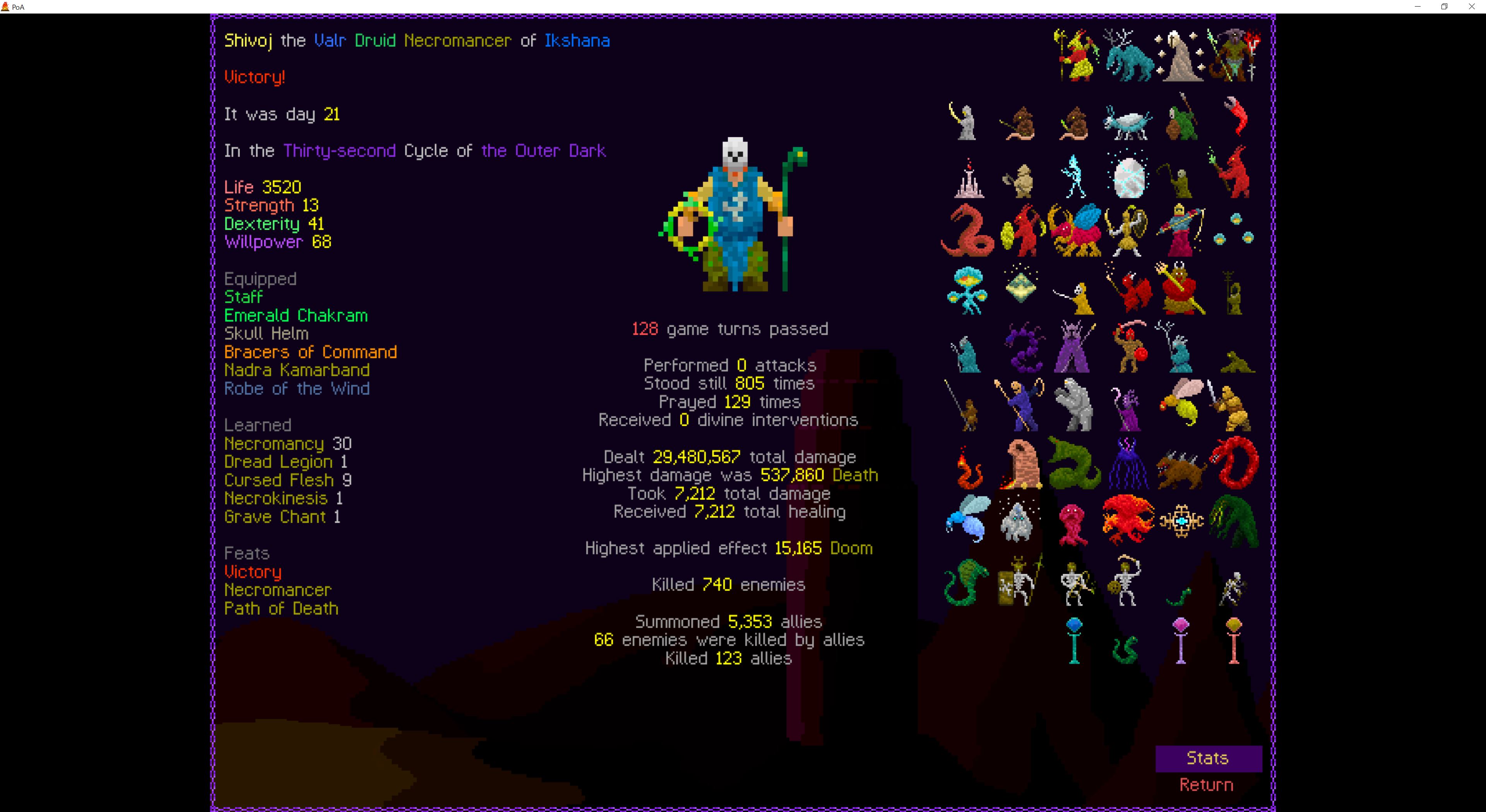 So it ended up being perhaps a bit more generic than I liked. I was trying to get cute and figure out a way to make Myrmidon viable because of that sexy shield she has, but it ended up being too painful and clunky. Also I gotta say WTF is that damage? That was the quickest final boss fight I've seen on cycle 32. 6000 repulsion, Jade Veil, and loincloth is really enough to dome him like that? My last fucking run took like 45k charge to finally finish him off.