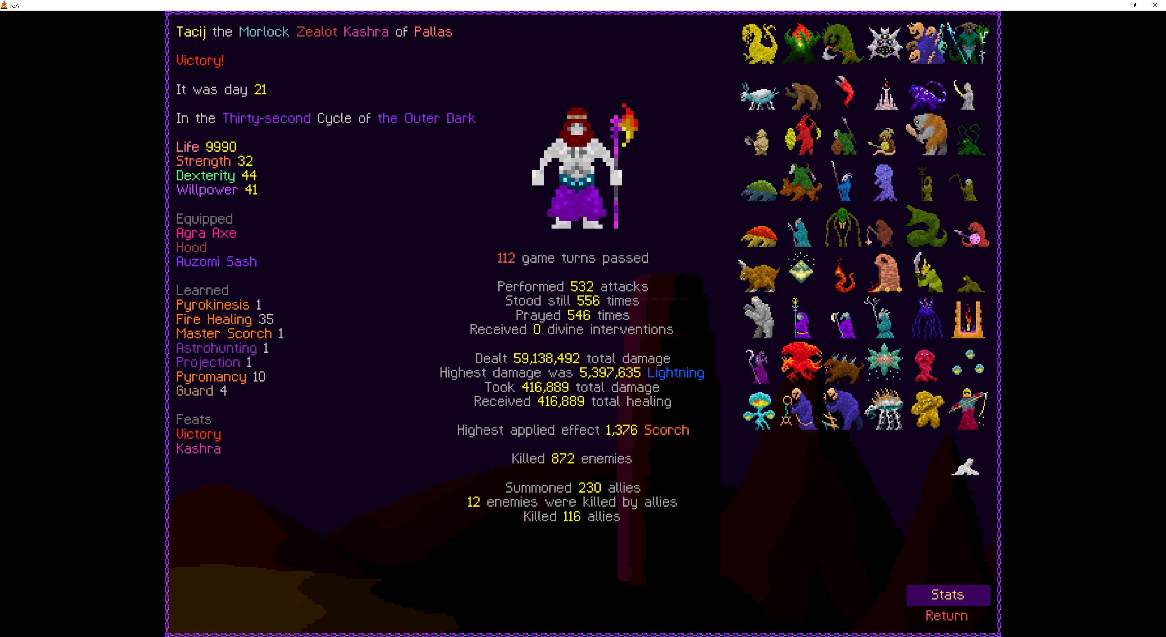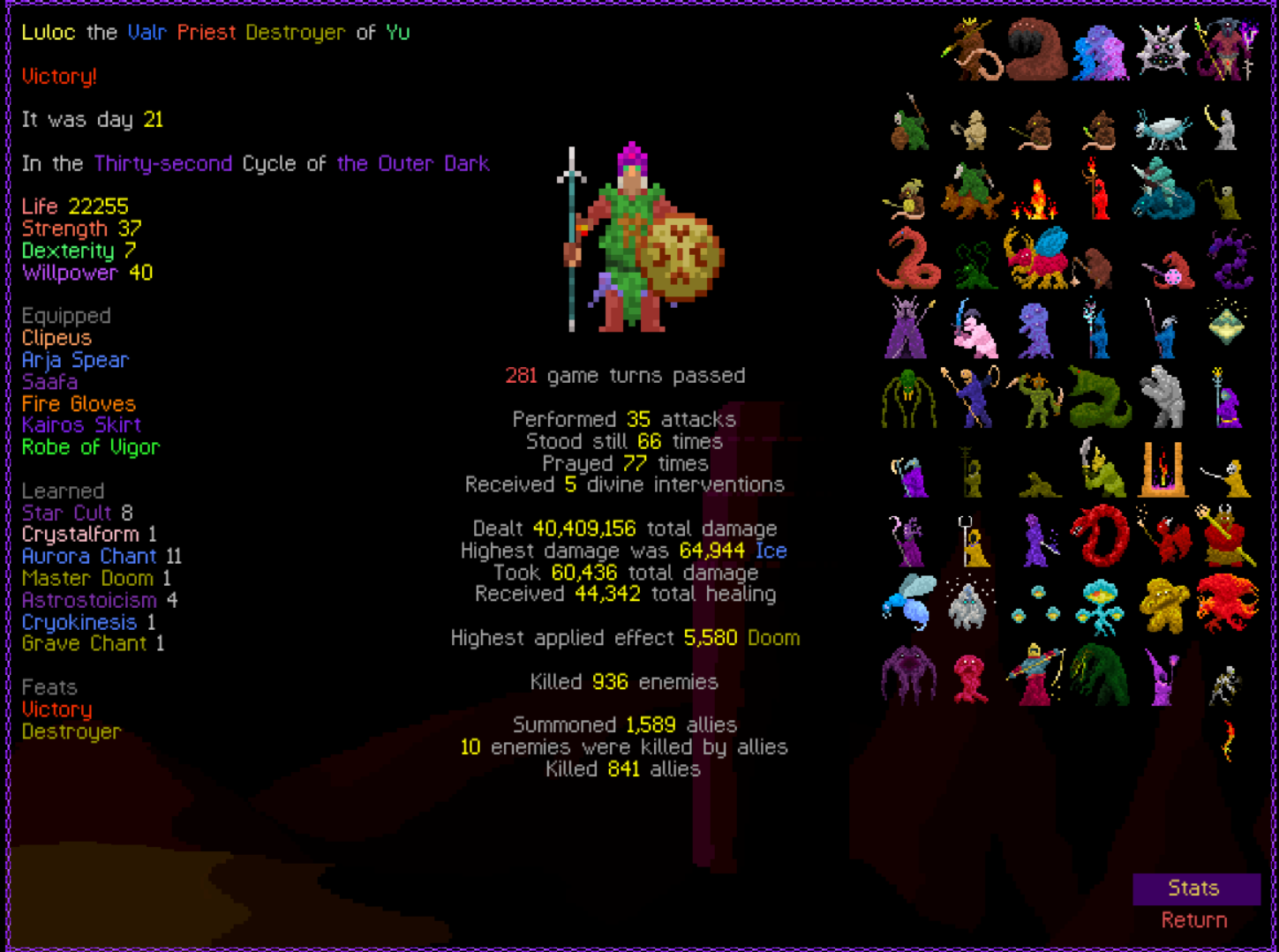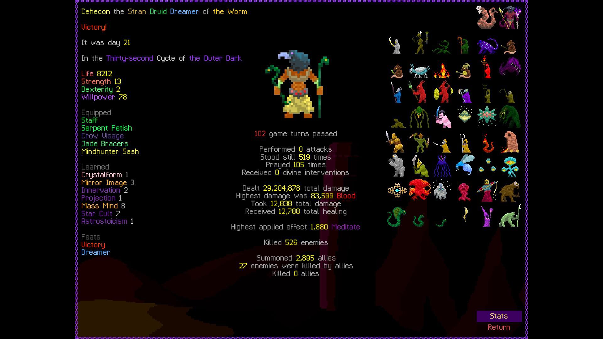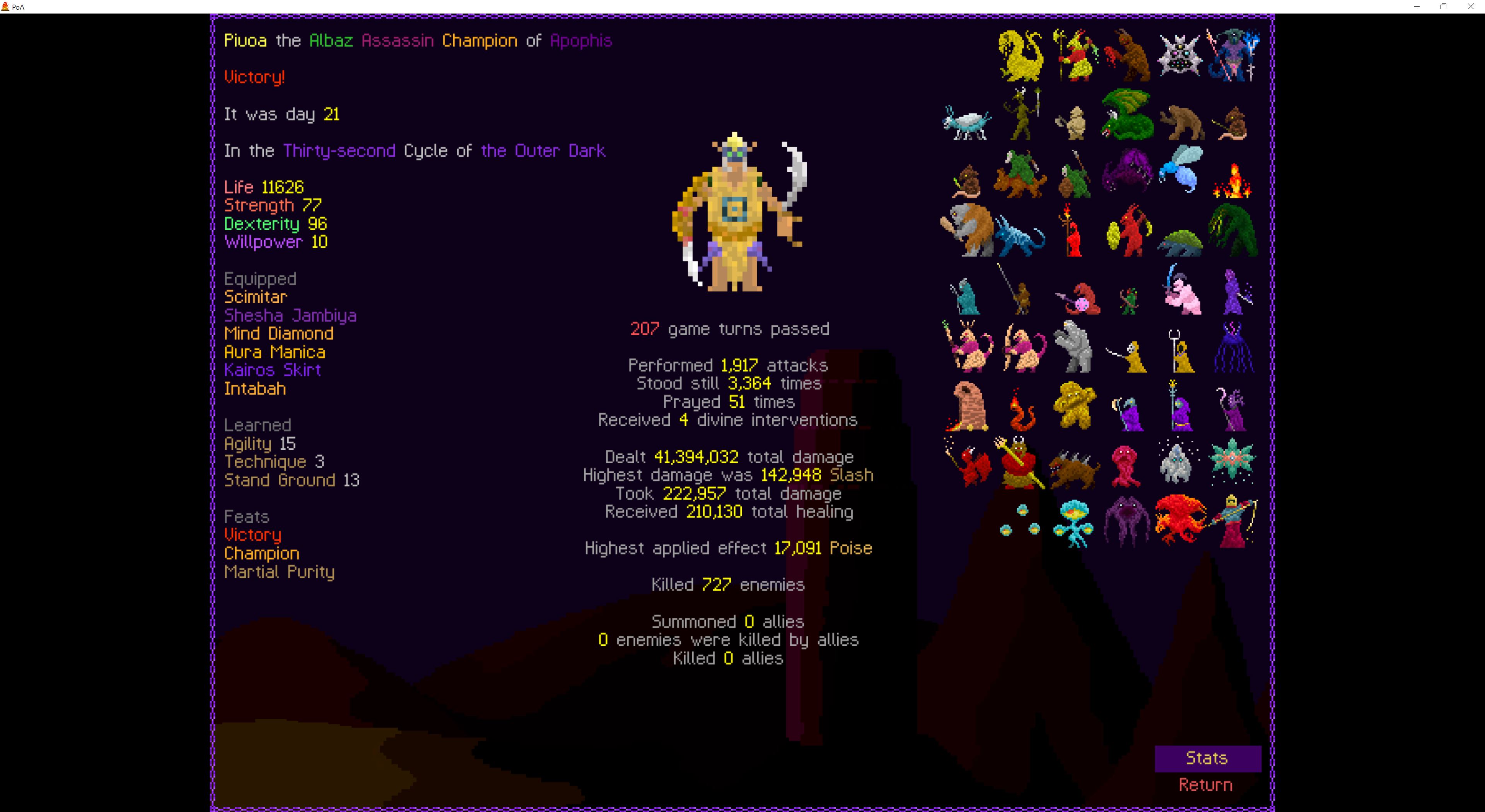 So it ended up being perhaps a bit more generic than I liked. I was trying to get cute and figure out a way to make Myrmidon viable because of that sexy shield she has, but it ended up being too painful and clunky. Also I gotta say WTF is that damage? That was the quickest final boss fight I've seen on cycle 32. 6000 repulsion, Jade Veil, and loincloth is really enough to dome him like that? My last fucking run took like 45k charge to finally finish him off.