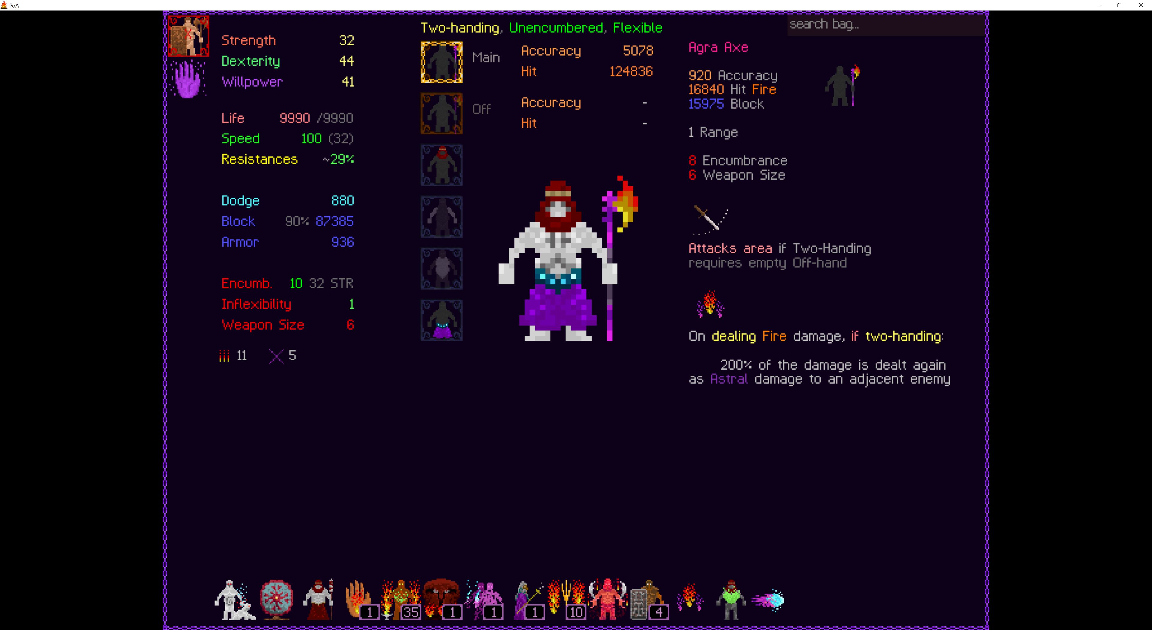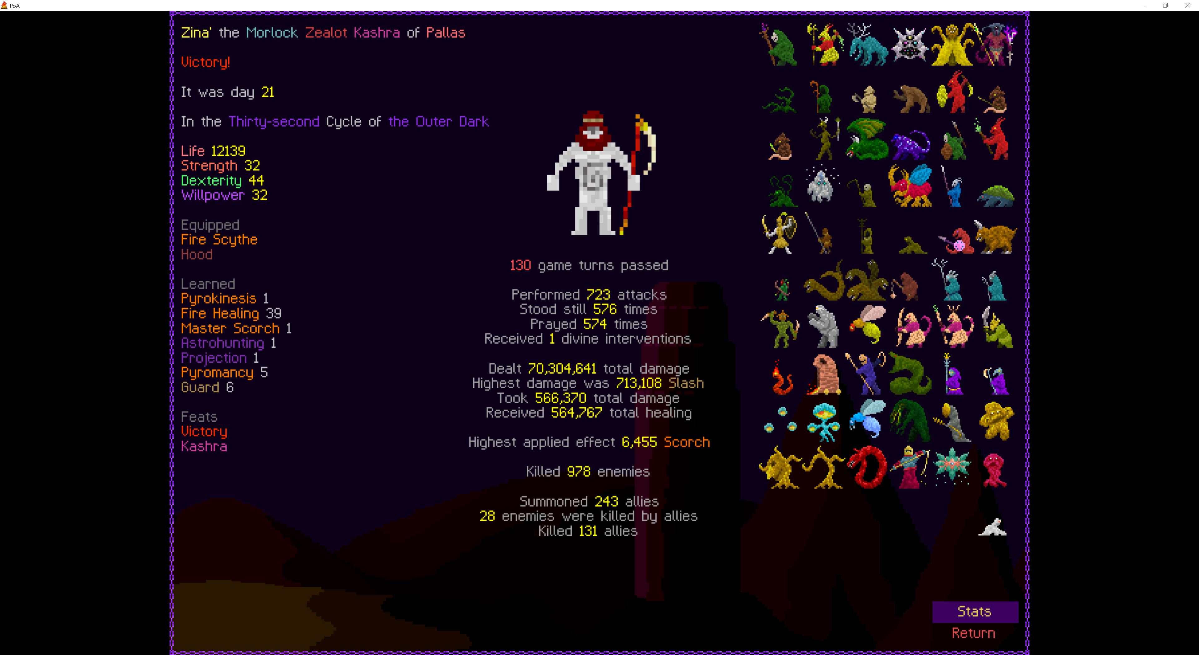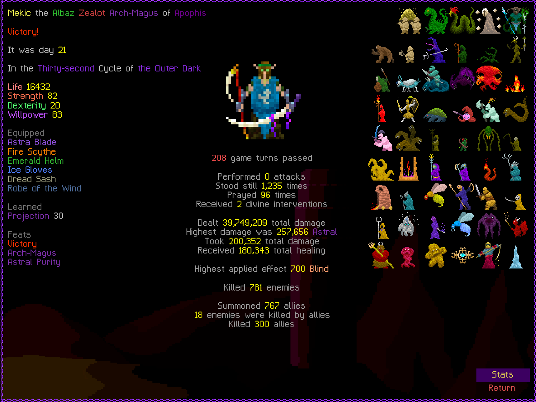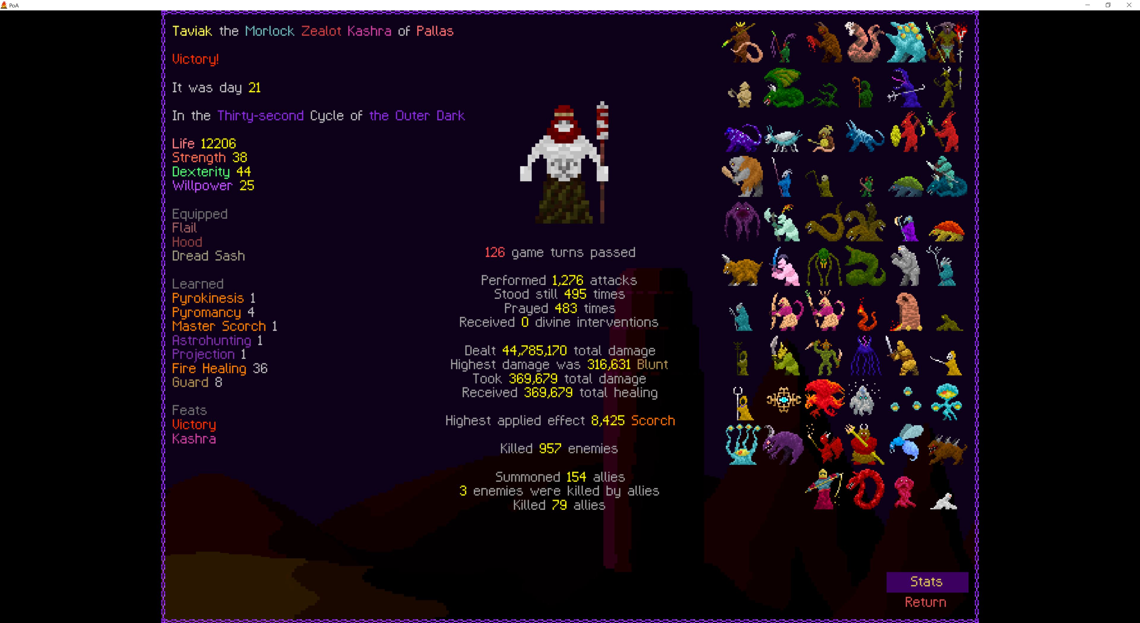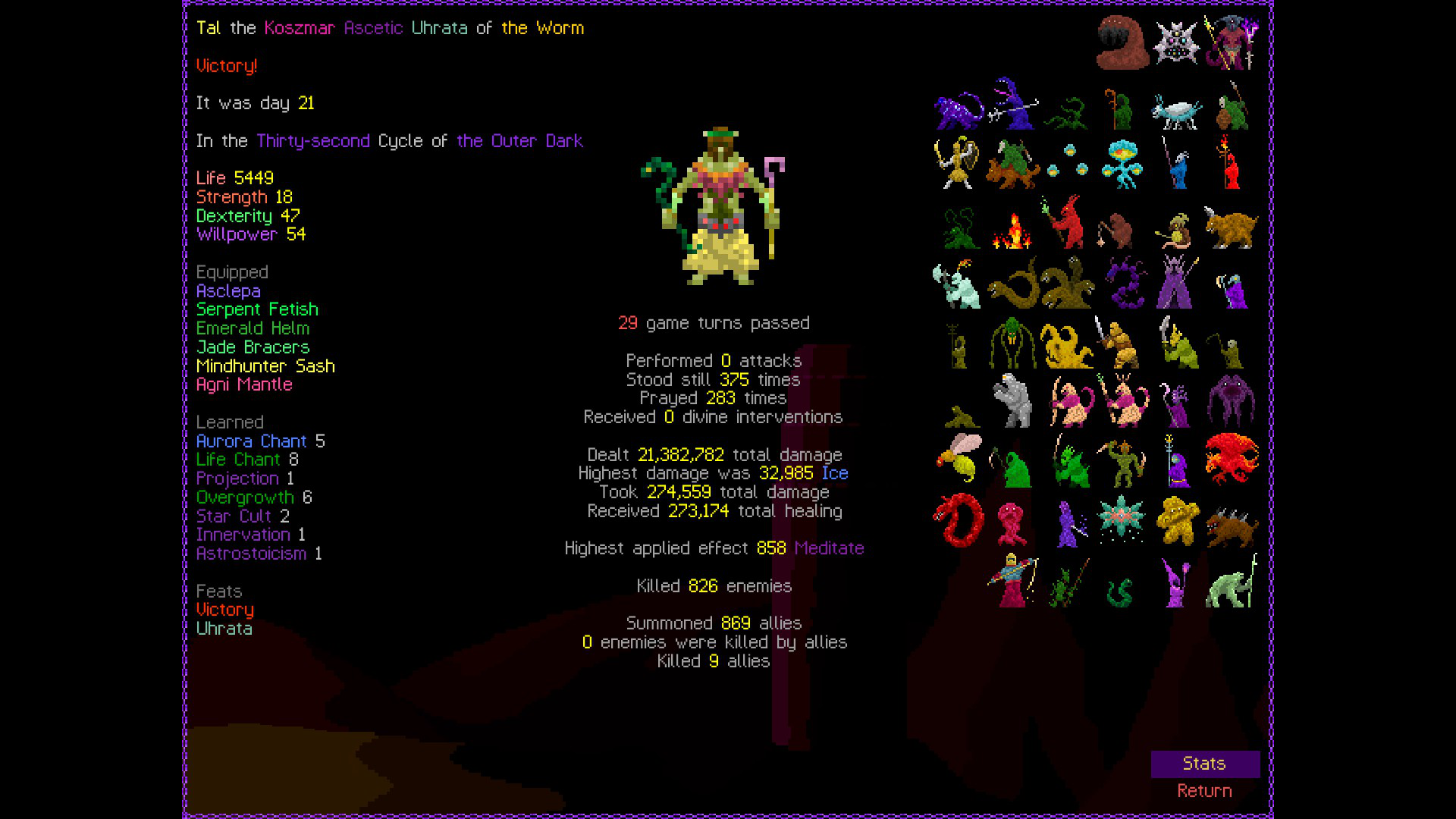 So it ended up being perhaps a bit more generic than I liked. I was trying to get cute and figure out a way to make Myrmidon viable because of that sexy shield she has, but it ended up being too painful and clunky. Also I gotta say WTF is that damage? That was the quickest final boss fight I've seen on cycle 32. 6000 repulsion, Jade Veil, and loincloth is really enough to dome him like that? My last fucking run took like 45k charge to finally finish him off.