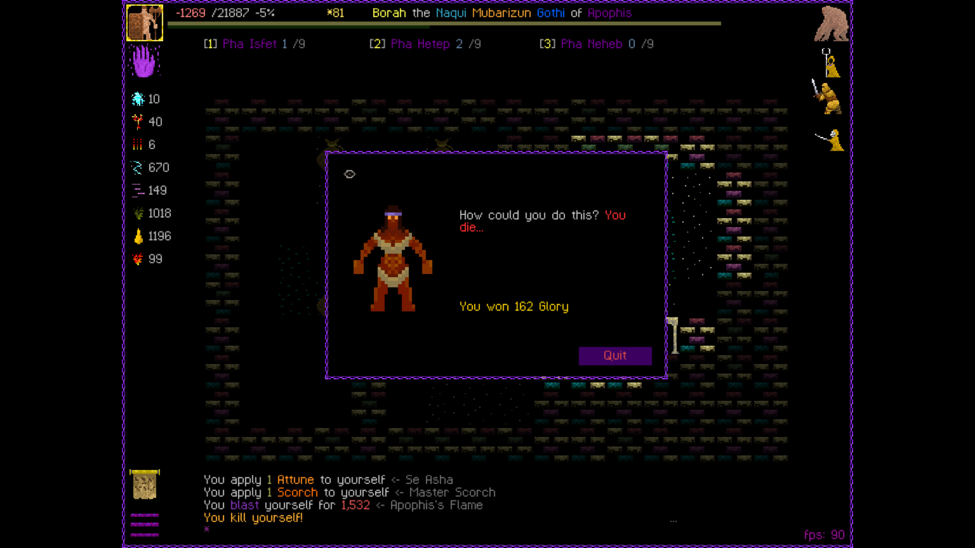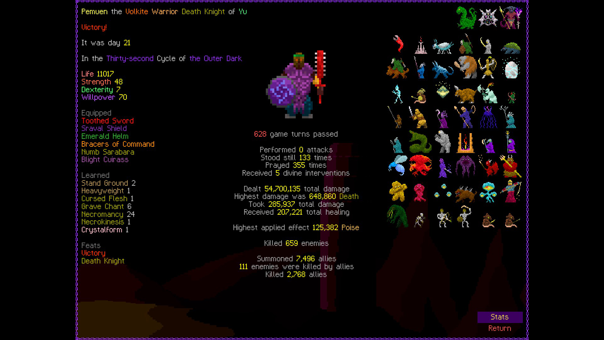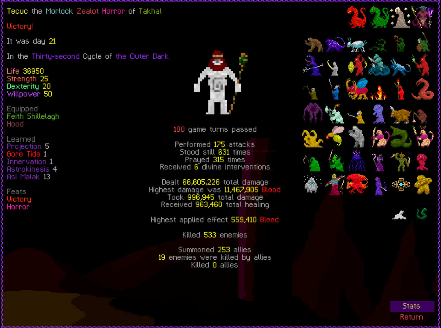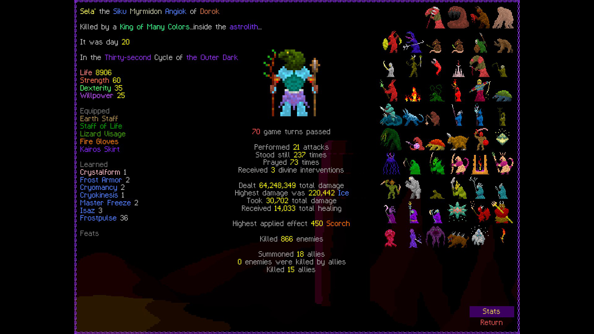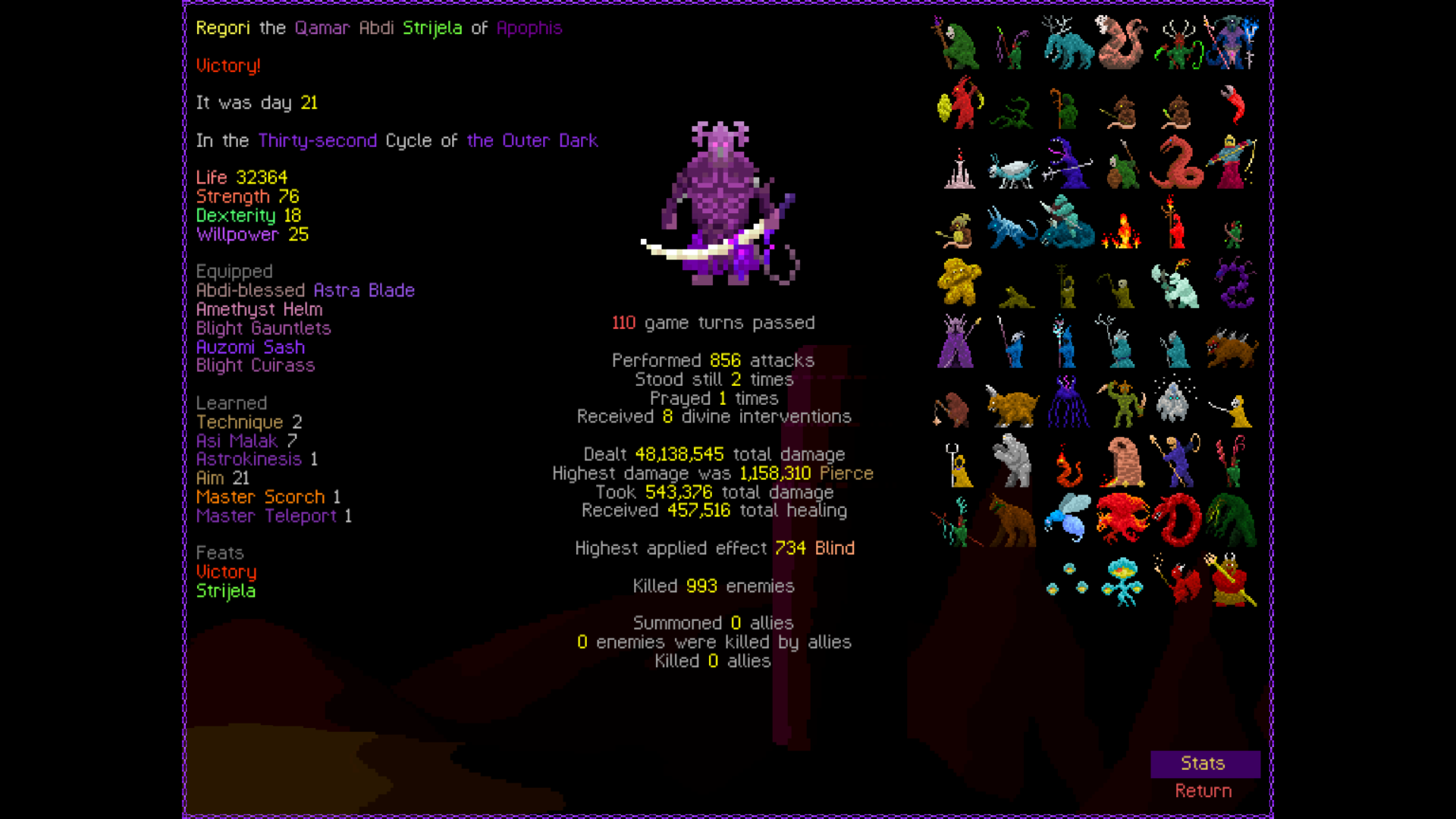 So it ended up being perhaps a bit more generic than I liked. I was trying to get cute and figure out a way to make Myrmidon viable because of that sexy shield she has, but it ended up being too painful and clunky. Also I gotta say WTF is that damage? That was the quickest final boss fight I've seen on cycle 32. 6000 repulsion, Jade Veil, and loincloth is really enough to dome him like that? My last fucking run took like 45k charge to finally finish him off.