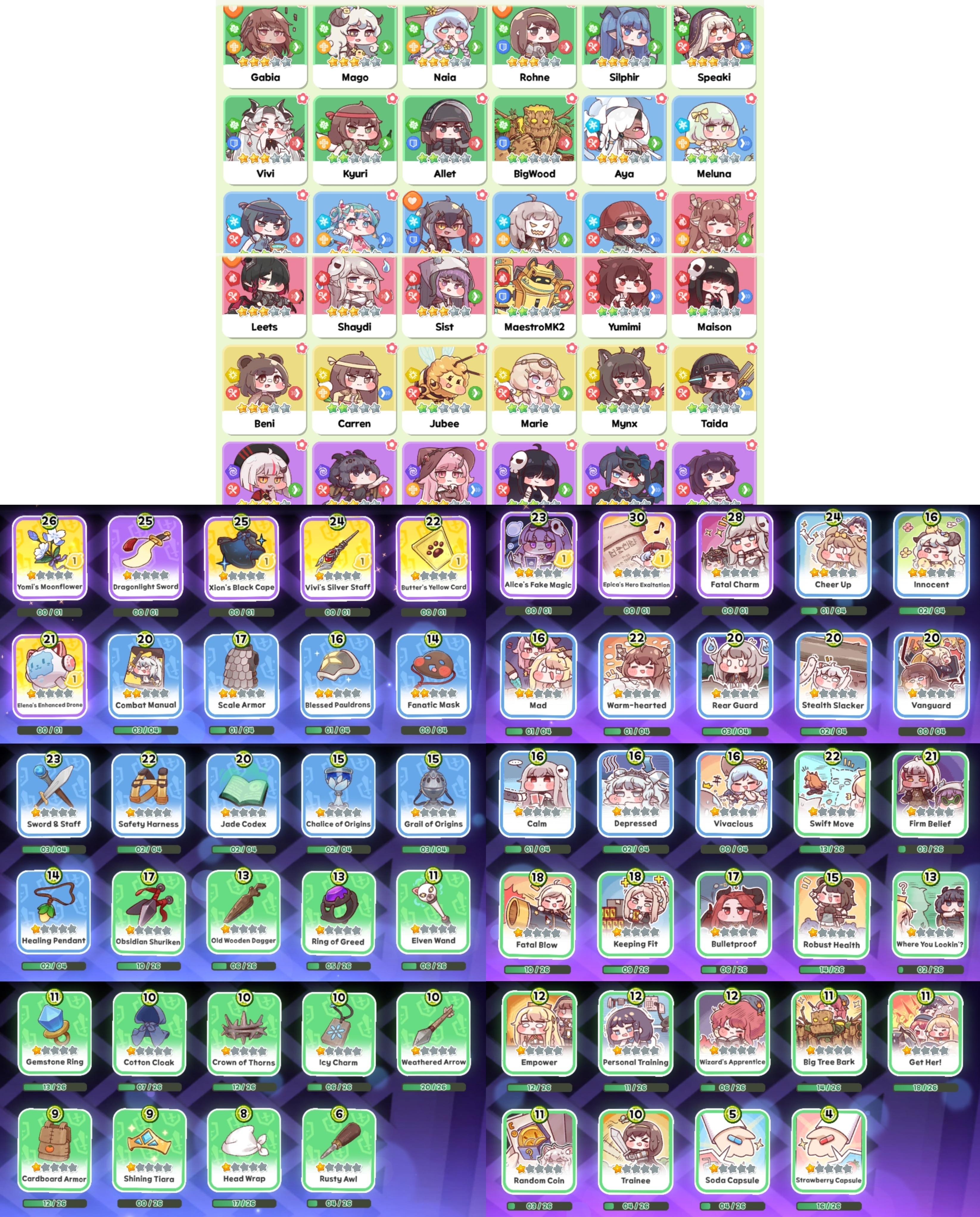 After about 2 weeks this what I got (festa not in picture). I've mostly been using Leets, Velvet, Rohen, Gabia and Xion since they were the first ones I got, but it should be be time to build something. Haven't really messed with cards either. Suggestions?