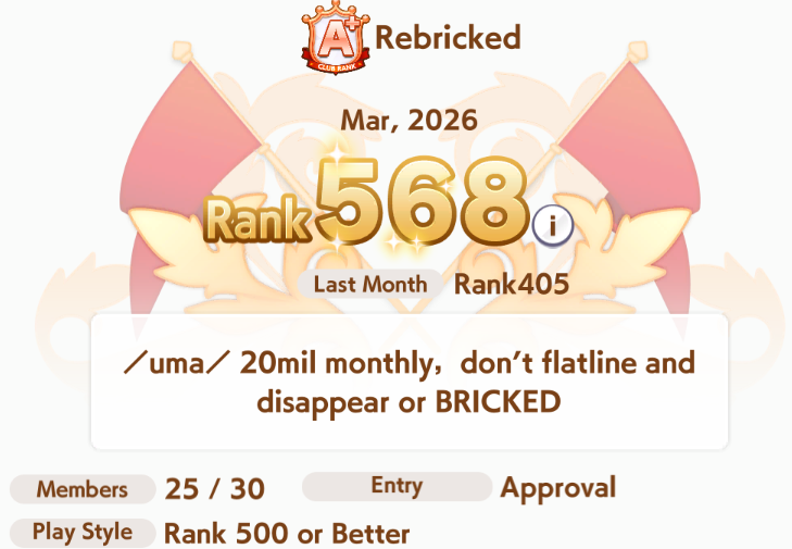 >>559097726Rebricked (formerly Le Fishe) (formerly Bricked) (formerly Unbricked) is recruiting. We have a few open spots, so reply with your ID if you're interested or apply with /uma/ in your profile. Just don’t disappear for 5 days without a heads-up. (20m/month quota)