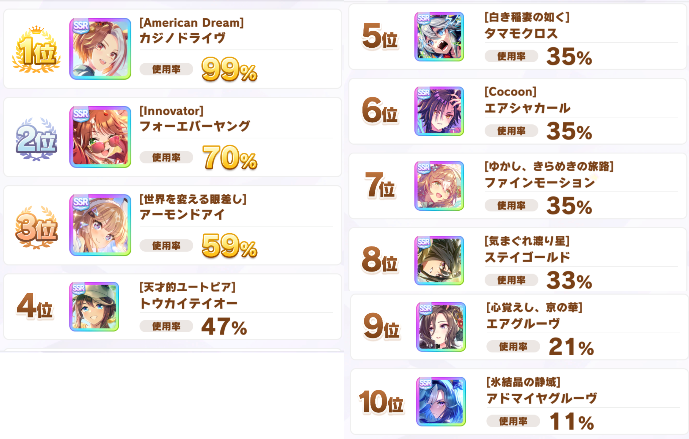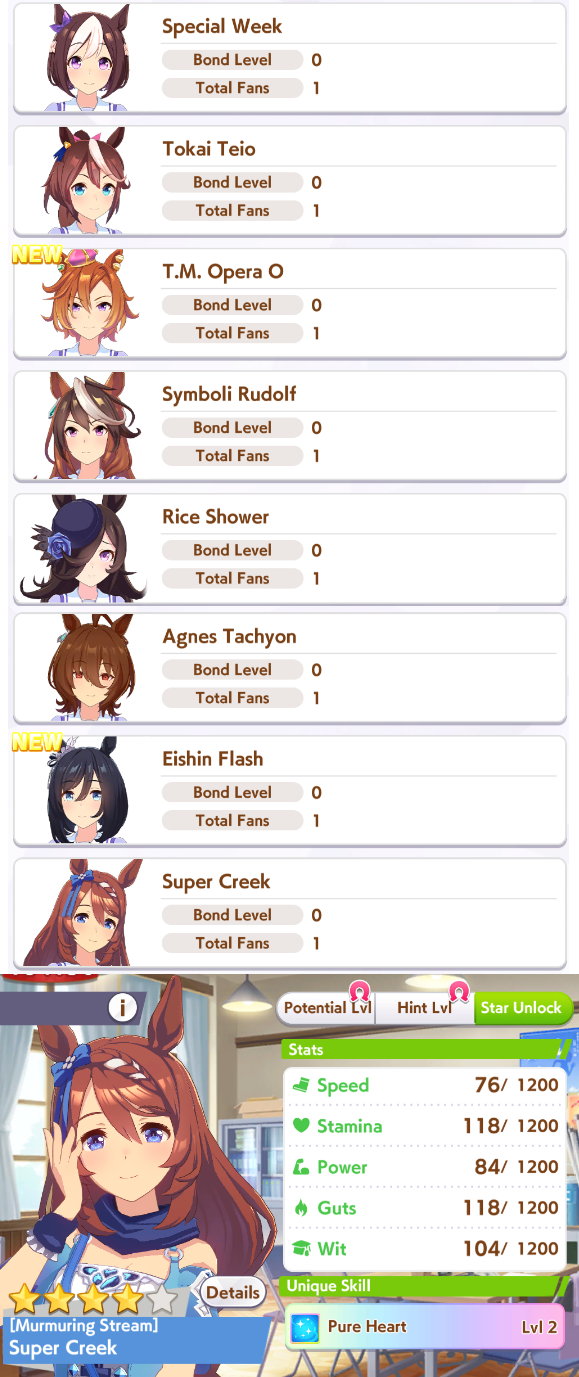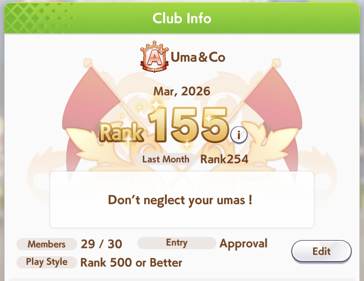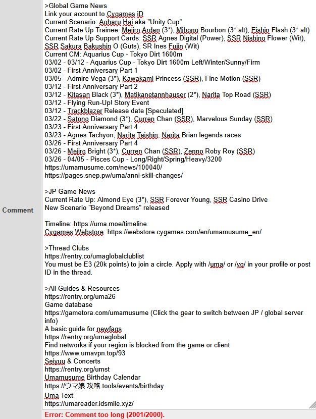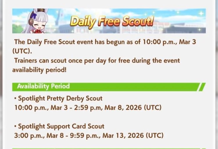 Previous: >>559085206>Global Game NewsLink your account to Cygames iDCurrent Scenario: Aoharu Hai aka "Unity Cup"Current Rate Up Trainee: Mejiro Ardan (3*), Mihono Bourbon (3* alt), Eishin Flash (3* alt)Current Rate Up Support Cards: SSR Agnes Digital (Power), SSR Nishino Flower (Wit), SSR Sakura Bakushin O (Guts), SR Ines Fujin (Wit)Current CM: Aquarius Cup - Tokyo Dirt 1600m03/02 - 03/12 - Aquarius Cup - Tokyo Dirt 1600m Left/Winter/Sunny/Firm03/02 - First Anniversary Part 103/05 - Admire Vega (3*), Kawakami Princess (SSR), Fine Motion (SSR)03/12 - First Anniversary Part 203/12 - Kitasan Black (3*), Matikanetannhauser (2*), Narita Top Road (SSR)03/12 - Flying Run-Up! Story Event03/12 - Trackblazer Release date [Speculated]03/22 - Satono Diamond (3*), Curren Chan (SSR), Marvelous Sunday (SSR)03/23 - First Anniversary Part 403/23 - Agnes Tachyon, Narita Taishin, Narita Brian legends races03/26 - First Anniversary Part 403/26 - Mejiro Bright (3*), Curren Chan (SSR), Zenno Roby Roy (SSR)03/26 - 04/05 - Pisces Cup - Long/Right/Spring/Heavy/3200https://umamusume.com/news/100040/https://pages.snep.pw/uma/anni-skill-changes/>JP Game NewsCurrent Rate Up: Almond Eye (3*), SSR Forever Young, SSR Casino DriveNew Scenario "Beyond Dreams" releasedTimeline: https://uma.moe/timelineCygames Webstore: https://webstore.cygames.com/en/umamusume_en/>Thread Clubshttps://rentry.co/umaglobalclublistYou must be E3 (20k points) to join a circle. Apply with /uma/ or /vg/ in your profile or post ID in the thread.>All Guides & Resourceshttps://rentry.org/uma26Game databasehttps://gametora.com/umamusume (Click the gear to switch between JP / global server info)A basic guide for newfagshttps://rentry.org/umaglobalFind networks if your region is blocked from the game or clienthttps://www.umavpn.top/93Seiyuu & Concertshttps://rentry.org/umstUmamusume Birthday Calendarhttps://ウマ娘.攻略.tools/events/birthdayUma Texthttps://umareader.idsmile.xyz/