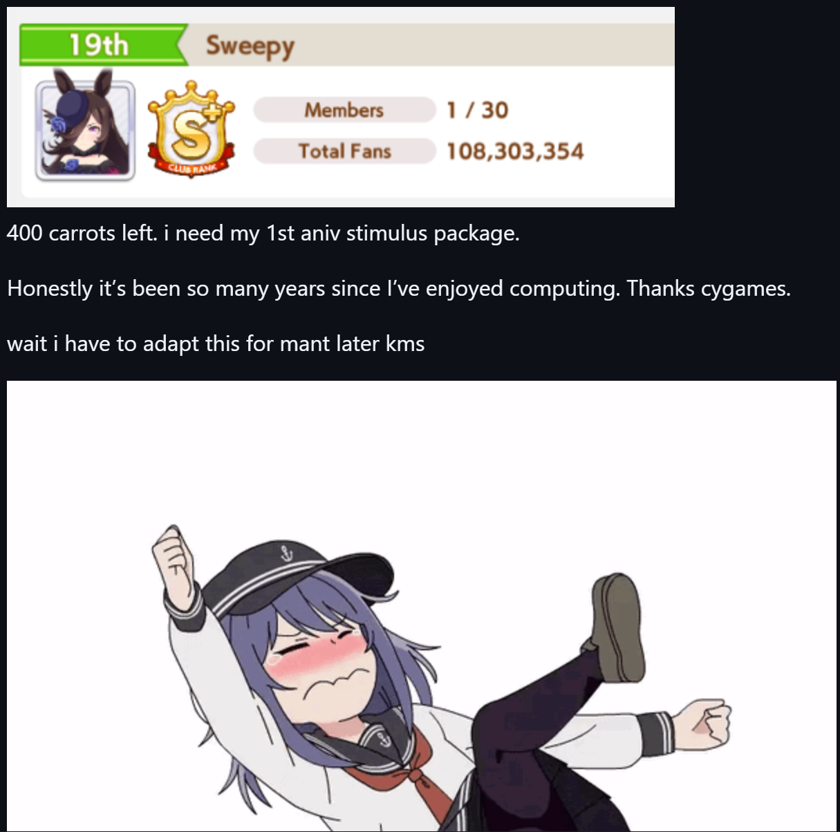 We all made our dirt aces already and grinding long uma before MANT is a waste of time, continue shitposting.