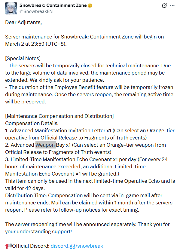 >Maintenance Noticehttps://x.com/SnowbreakEN/status/2028470386611089756>Decensor Guidehttps://rentry.org/begoneclouds>Trailers3.5 Trailer: https://www.youtube.com/watch?v=wkF3MLwlZ-03.5 Stream: https://www.youtube.com/watch?v=lF76XrT_YicAcacia - Chrono Echo Operative Trailer: https://www.youtube.com/watch?v=MoDOWs-FqeQMarian - Aquila Operative Trailer: https://www.youtube.com/watch?v=4p-rMmXV7jYASMR:https://x.com/SnowbreakJP/status/2022521178645238145https://x.com/SnowbreakEN/status/2022521180381458610>Newshttps://x.com/SnowbreakEN>PlatformsAndroid/iOSPC (Recommended): Standalone launcher, Steam, EGSDownload from main site: https://snowbreak.amazingseasun.com/>Current & Upcoming Events[Jan 29 - Mar 12] Expedited Access to Chapter 16 “Back from Bygone”[Jan 29 - Mar 12] Let’s Optimize, Heimdall![Feb 05 - Mar 12] Dono Duel[Feb 12 - Mar 12] Special Invitation (Claim Marian - Aquila for free)[Feb 12 - Mar 04] Starward Defense[Feb 16 - Mar 12] Heartfelt Messages[Feb 23 - Mar 09] Clash of Honor[Feb 26 - Mar 12] Hero Games>Current & Upcoming Banners[Jan 29 - Mar 12] Acacia - Chrono Echo | Moonwake Blade[Jan 29 - Mar 12] Banner Selector 1 (Choose one of Chenxing - Ethereal Cloud, Cherno - Enigma, Katya - Dawnwing and Vidya - Celestial Swan)[Jan 29 - Mar 12] Banner Selector 2 (Choose two of Lyfe - Infinite Sight, Fenny - Starshine, Chenxing - Jade Arc, Yao - Nightglow, Enya - Tempest, Katya - Rhapsody and Tess - Phantasia)[Feb 12 - Mar 12] Marian - Aquila | Core Prism[Feb 19 - Mar 12] Fenny - Pureheart | Welkin Starflare[Feb 19 - Mar 12] Siris - Freefin | Splash Glider>Codes (Redeem in [Settings > Other])followusACACIAEXPUPMARIANNIGHTPULSINGLOVE>/snowg/ Resource Pastebinhttps://rentry.org/snowg-resources>100 Pity Banner Type Detailshttps://rentry.org/snoblerate>/snowg/ Friends Formhttps://forms.gle/QaJ8N1x3MPo2JPKL7https://docs.google.com/spreadsheets/d/18uvxL8bqODpq0AxdzDE_0ho9FSs4P4fyecM Ut6ndQfM/Previous: >>558876290
