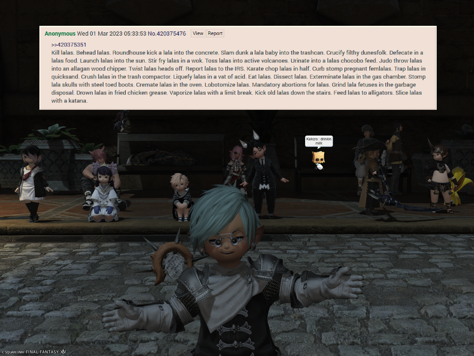 >>559122347I am an honorary member of the lalafell social circles as I have married a femlala thus have immunity.