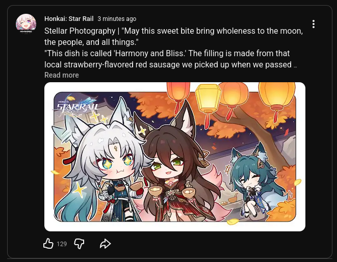 Previous: >>559123507>Download - https://hsr.hoyoverse.com/en-us/home>4.0 Preview Page - https://act.hoyoverse.com/sr/event/e20260206version-nwlbwa/index.html>Version 4.0 Trailer: "No Aha at Full Moon"https://www.youtube.com/watch?v=2hH0hILcWPshttps://www.youtube.com/watch?v=EMT6GmhDiBk>Sparxie Character Trailer: "Ravings"https://www.youtube.com/watch?v=NU6J88t4luM https://www.youtube.com/watch?v=AdUoc-nSB94 >I'll Never Forgive Star Railhttps://www.youtube.com/watch?v=7ia3b_9-znQ https://www.youtube.com/watch?v=gI-W8r-TWUM >Current Character Banners: Sparxie, Yao Guang, Cerydra, Rappa, Sparkle + Pela, Hanya, Qingque - https://www.hoyolab.com/article/44017918>New Drip Marketing:>Ashveil (5* Lightning Hunt) - https://www.hoyolab.com/article/43666646>Redeemable Codes - https://hsr.hoyoverse.com/giftKBJ8VZ6Y27QXXAK9QJ454SG7MH5KCBGF3AAT45QSTARRAILGIFT>/hsrg/ Tools & Resourceshttps://rentry.org/hsrg-resources-14>/hsrg/ Thread Templatehttps://rentry.org/hsrg-thread-template-14