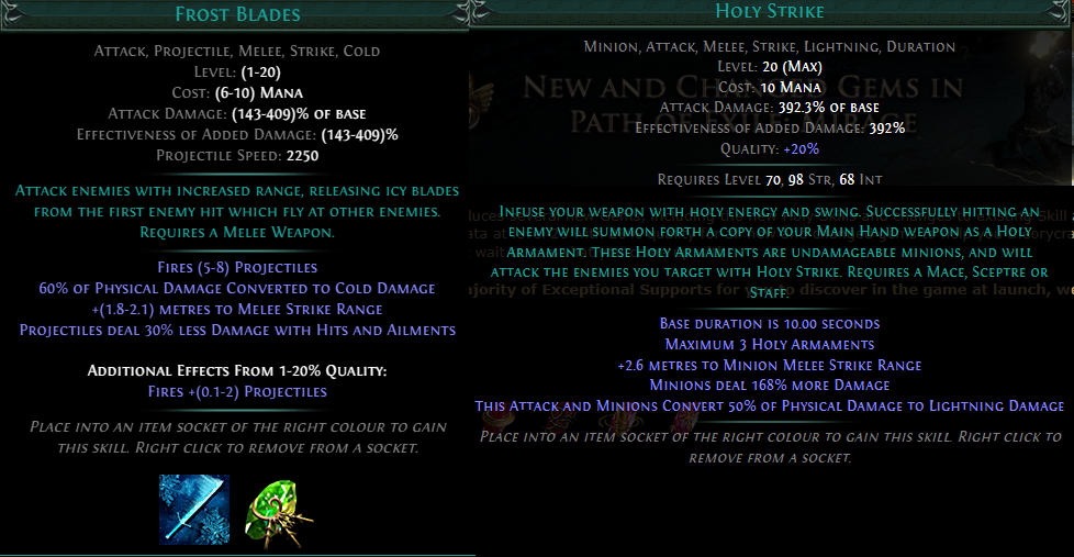 >>559168251it has lower base damage and effectiveness of added damage than fucking Frost Blades with zero AoE. You will not be playing this as a strike skill, it's a minion skill triggered on-hit where you'll ignore your own damage entirely (maybe taking Spiritual Aid as cope, but without the 168% more multiplier your own damage will still be horrible), you'll just stack attack speed and minion damage.Saying that it's a strike skill is like saying a spectre build using Cyclone+Cast While Channeling+Desecrate+Spirit Offering counts as playing a melee build even though their cyclone does 50k damage while their minions do 100 million. Don't kid yourself.