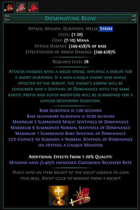 You guys are clueless. The fact that the minions use your weapon is NOT a good thing. For example, Dominating Blow's sentinel's base damage is 837-1255. Two handed Maelström staff with max phys rolls and q20% is 507-992. In fact, when doing the maths I think I cracked the algorithm.Dom blow: (837+1255)/2*2.8=2928.8Holy strike: (507+992)/2*3.92=2938.04The multipliers are the attack damage multipliers of the skills. The differences are so small, less than 0.3%, that I don't think it's a coincidence. It is how it is. So the Holy stirke minions are essentially Dom blow minions with some tradeoffs. With Dom you get more minions; with Holy you get 168% more dmg for the minions (essentially equating to 3*2.68=8.04, roughly eight dom blow minions). With Dom you get the convenience of minions clearing for you; with Holy you likely get the attack speed inherited from the weapon, which is up to 30% faster than the attack speed of Dom blow minions. Major issue with Holy strike is that it forces you to use a two-hander which Dom blow builds generally don't want to do. Conclusion: Maybe it's decent, but saying the numbers are amazing is abjectly false.