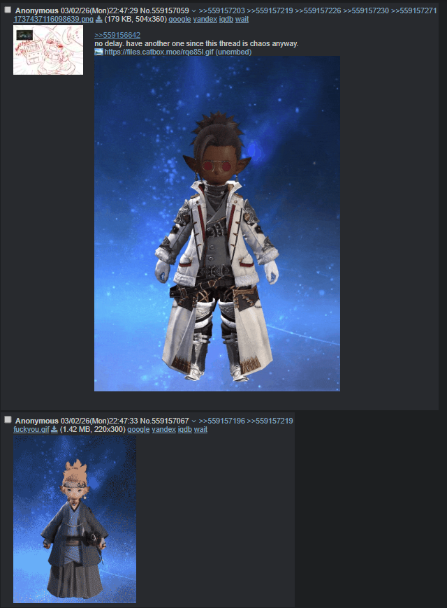 Handsome and heroic Lalaboys edition>Patch 7.41 Noteshttps://na.finalfantasyxiv.com/lodestone/topics/detail/fa89e48b03a6bf6deac50a23fdfc39f7df64fb2a>Little Ladies Day Feb 26 to March 12https://na.finalfantasyxiv.com/lodestone/special/2026/Little_Ladies_Day/ivf88rc2gm>Resourceshttps://rentry.org/xivgresources>Meetsups• March 4, 9:00 PM EST | Primal, Famfrit, Lavender Beds W15 P20 | Spooky Club: X-Files >>559084910 • March 6, 6:00 PM EST | Jenova Goblet W18 P43 | Mario Party Salty Bets >>558176762• March 13, 4:00 AM PDT | Balmung, Eulmore | Live Letter Meet >>558765025 >Previous bread>>559147134