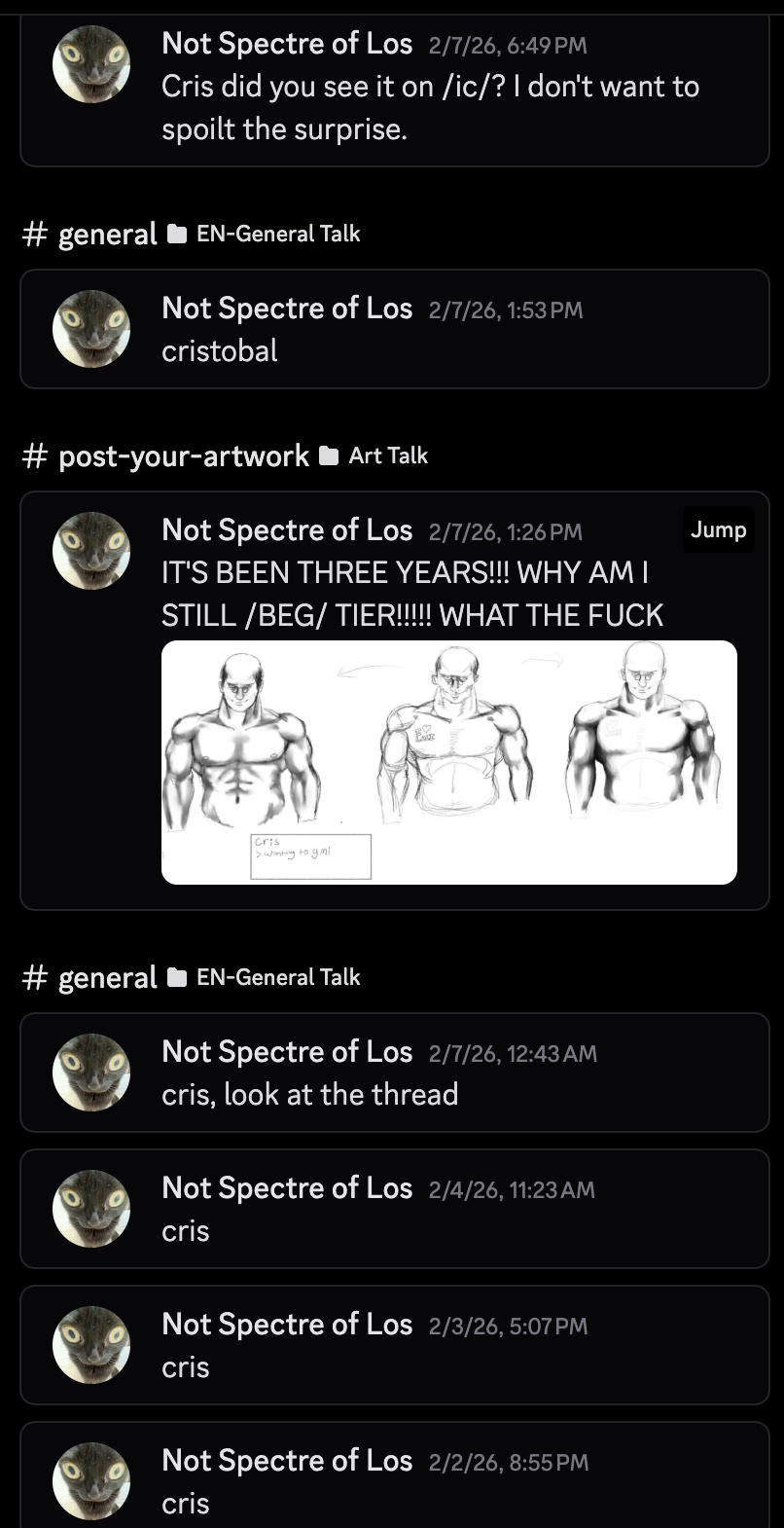 Anyways so yeah that's the story of the biggest crab on /agdg/.He's also the cause of the majority of fan art of cris. Now I don't have all of his shit archived but he attempted to rip off one armed bandit and posed as them, I don't have proof of this but before he was known as the spectre of los he was known as orb schizo and was making a game about slimes. He is easily the dev with the most failed projects and without a real pesona linked to him it's impossible to know how many failed and abanonded /agdg/ projects were just him being a retard. And get this, the reason he hates betz is because betz fucked up the audio of the videogame omnigon and he blames the failure on /v/3. Now that fygoon has called him out he's gone silent on discord and it likely preparing for another schizo war. His shitty art style is very recognizable and that's his biggest downfall and how I've been able to track him down over the years. Also I'm 80% sure cristofan is just another persona he made the fuck up.Be on the look out for this person, they have no real goals and frankly should get kicked out of the aggy community. I've never seen them make a real project.Also you know all the hate lovely azurcutie gets? fabricated by los to remain the dominant artist on /agdg/this rabbit hole is ridiculously deep and he'll just pretend he's an innocent chungus.