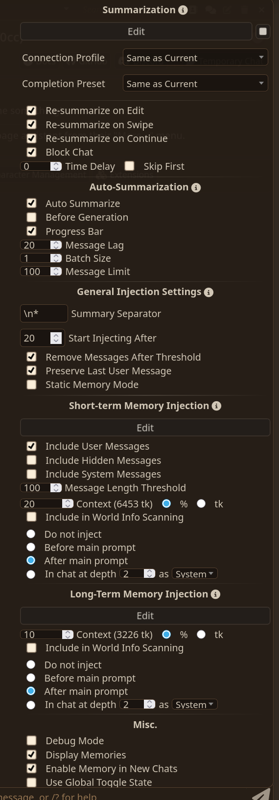 Are these settings reasonable for qvink's message summarize extension? I have 32k context.