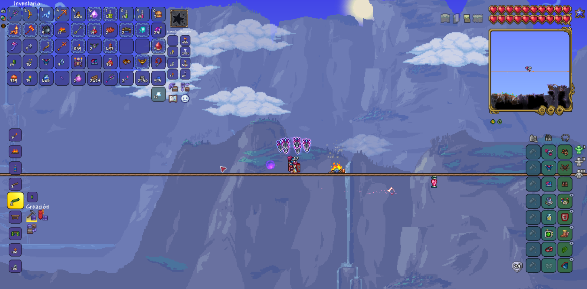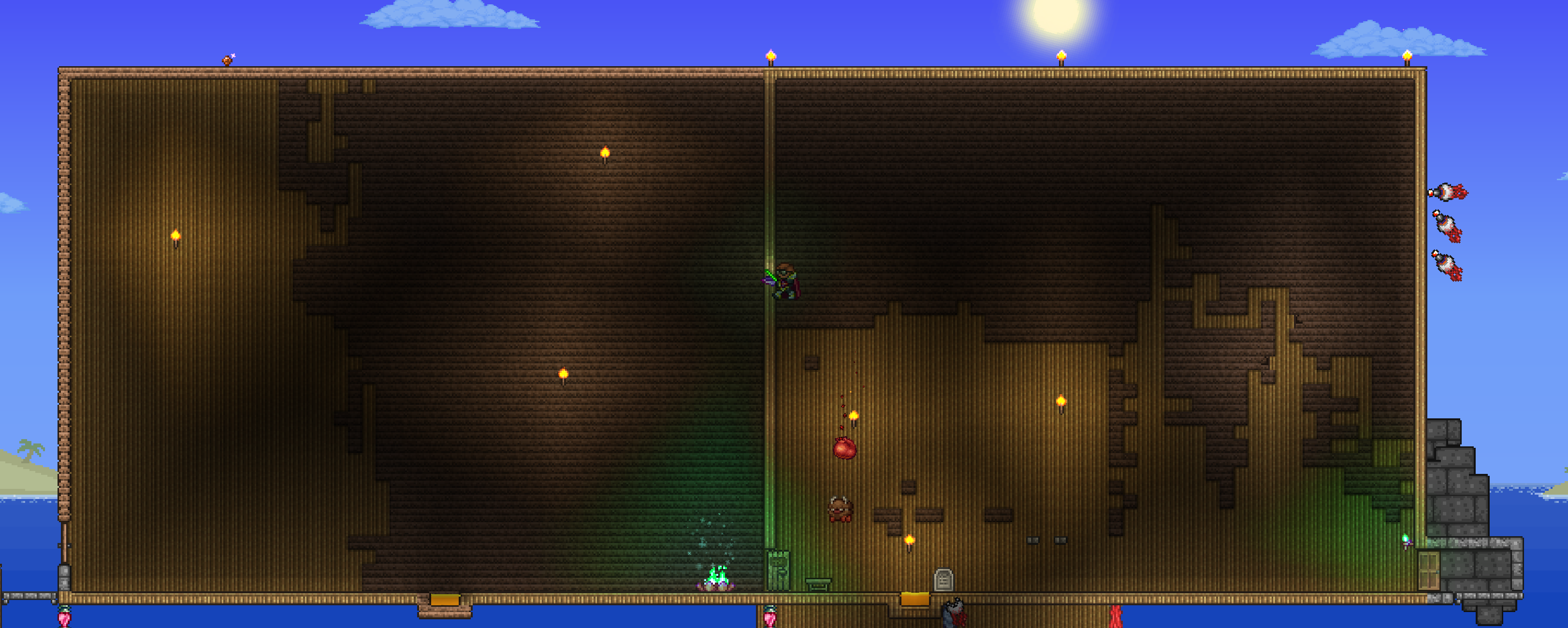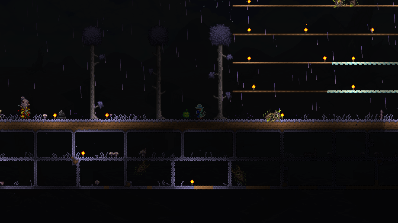 >>559314952idk how you got 'underground' out of them not growing in the center of the mapwhat you'll need is all the dirt you can spare (ideally a multiple of 241; I used 2410 dirt), and all the rope you have.go to one of your oceans, find where the water meets the beach, and rope straight up until you hit the top of the world.once you're there, separate out 100 rope, and drop it down right next to the rope you're climbing on, starting from the world's height limit.this should create a 100-tile long rope starting from the top of the world next to the rope you used to climb up there.climb down to where that rope ends, and place a single dirt block at the end of that rope.start building a dirt bridge horizontally off of that dirt block until you run out of dirt.you will be harassed by harpies and wyverns while building, that's just how it is, so be prepared for that. i recommend bringing a summon along just as an early warning system. when you want to harvest, just climb up there after a couple in-game terraria days and there'll be 5-6 plants ready to go. i recommend using a unicorn or some other fast mount to run the length of your bridge.note: the dirt bridge must be 95 blocks or more away from the world border, otherwise strange plants won't grow - that's what the length of 100 rope dropping down is for, just to be safe. strange plants also try to grow every 240 blocks, that's why you want a multiple of 241.