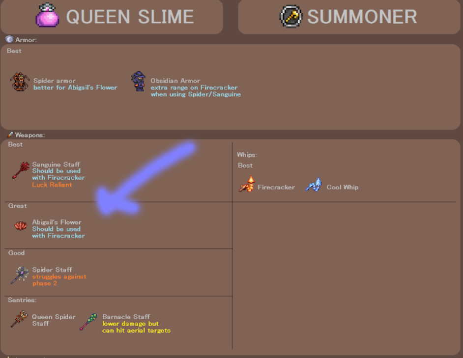 >>559285621I went from Sanguine to Desert Tiger to Stardust Dragon. I tried out Deadly Sphere and it felt awful not having them able to go through walls coming from the Desert Tiger. Empress of Light seemed not only very hard to beat but the summoning item is annoying to get so trying again after my first loss seemed annoying and I decided to come back to her later. Xeno Staff didn't drop for me after my first Martian Invasion also, unfortunately, so didn't bother with it.