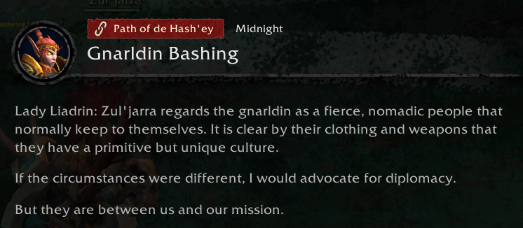 >>559218759It's the 5th race of Elves and they already struggle to do anything with Nightborne. The time for Haranir to be introduced in the story was an expansion ago, they missed their chance by pushing it back and forcing K'aresh as the ending of War Within. Now their zone, their race, and their storyline just feels out of place in Midnight. I'm also personally biased in the fact I'd much prefer Talanji's VA to actually be voicing Talanji so the Zandalari can be more involved in the plot, than Orewyna for a new allied race.