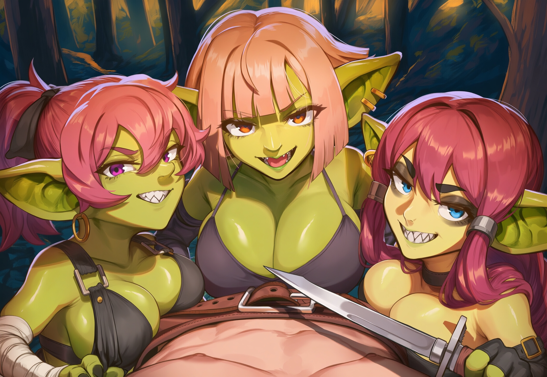 >>559244538human male pov of three femgob rogues in the process of removing his belt and pants. one of them threatening him with a knife