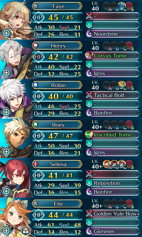 >>559275843I really wanted to make a team of very tanky mages and a bow user with a fuckton of HP. I gave faye infantry pulse so she'd make reduce everyones CD and have them ignis bomb everyone into extinction. The main idea being CC+QR+drive def/res or something. I still have all the 5* books to make them +10 but never pulled the trigger. Selena was my attempt at making a mega tank. She has firesweep sword.I also tried to give etie some big insta nuke build.I haven't touched them in years and I keep unequipping shit for some reason