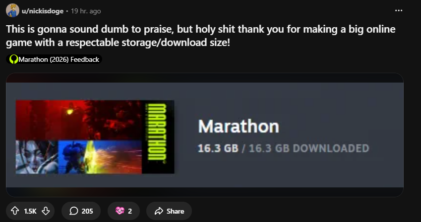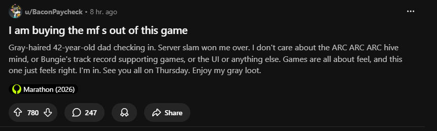 Its crazy how Bioware has more going for them now compared to nuBungie. At least they realized they had no business going down the live service route, even if their writing is long past its golden days. And at least they were able to say the game reached 1.5 Million players 3 months after launch, who knows how long it'll take Marathon to reach that same point.