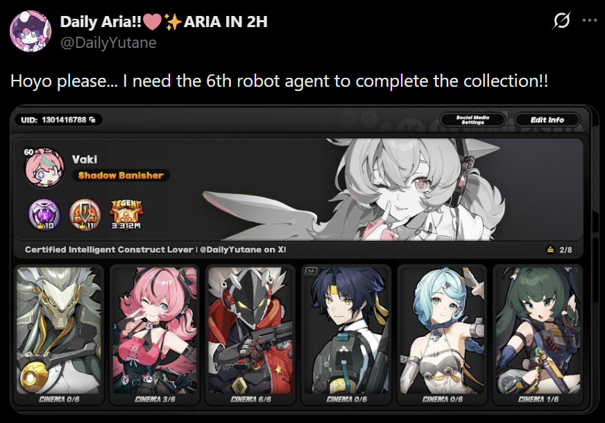 Previous: >>559250074 >NewsAgent Record | Cissiahttps://www.hoyolab.com/article/43750810Agent Record | Nangong Yuhttps://www.hoyolab.com/article/43737155Version 2.6 "Encore for an Old Dream" Special Programhttps://youtu.be/oTRy9pZ4TYE >Newest Trailer/Teaser/Character demohttps://youtu.be/HuW-WYjg-fAhttps://youtu.be/eFaQVb4mneEhttps://youtu.be/0DmndMnuh5E (EN)https://youtu.be/TJXSiIESLyc (JP)https://youtu.be/06G8YgOrXTw (EN)https://youtu.be/FJ0HD6RC6PY (JP) >Upcoming Events for 2.6https://zenless.hoyoverse.com/en-us/news/162561A Harmony of Delusions 02/05 - 03/23Angel's Invitation 02/05 - 04/15Delusion Special 02/05 - 03/23Potential Hypothesis: Frosted Feathers 02/05 - 03/23Livestream for Fluttering Wings 02/05 - 03/23Gilded Surprise, Wonderful Boo-ns 02/14 - 02/25Stacking Fortune 02/16 - 02/24Advanced Bounty: Area Patrol 02/25 - 03/02Gravitational Storytime 03/04 - 03/23"En-Nah" Cheersquad Gift 03/04 - 03/23Snap! Hollow Real Showdown 03/09 - 03/23High Score Card Collector 03/16 - 03/23 >Redeemable codes (claimable in-game or online)https://zenless.hoyoverse.com/redemptionZENLESSGIFTZHAOISFREEZZZANGELSZZZ26DELUSIONAODDEBUTZZZCREATOR26 ZZZCUTENESSZZZGIGO >Resources and useful linkshttps://rentry.org/zzzlinkshttps://rentry.org/ZZZ-Friendshttps://rentry.org/ZZZ-Guilds >/zzz/ OP pastebin (use this if making new thread):https://pastebin.com/PzbMf13P