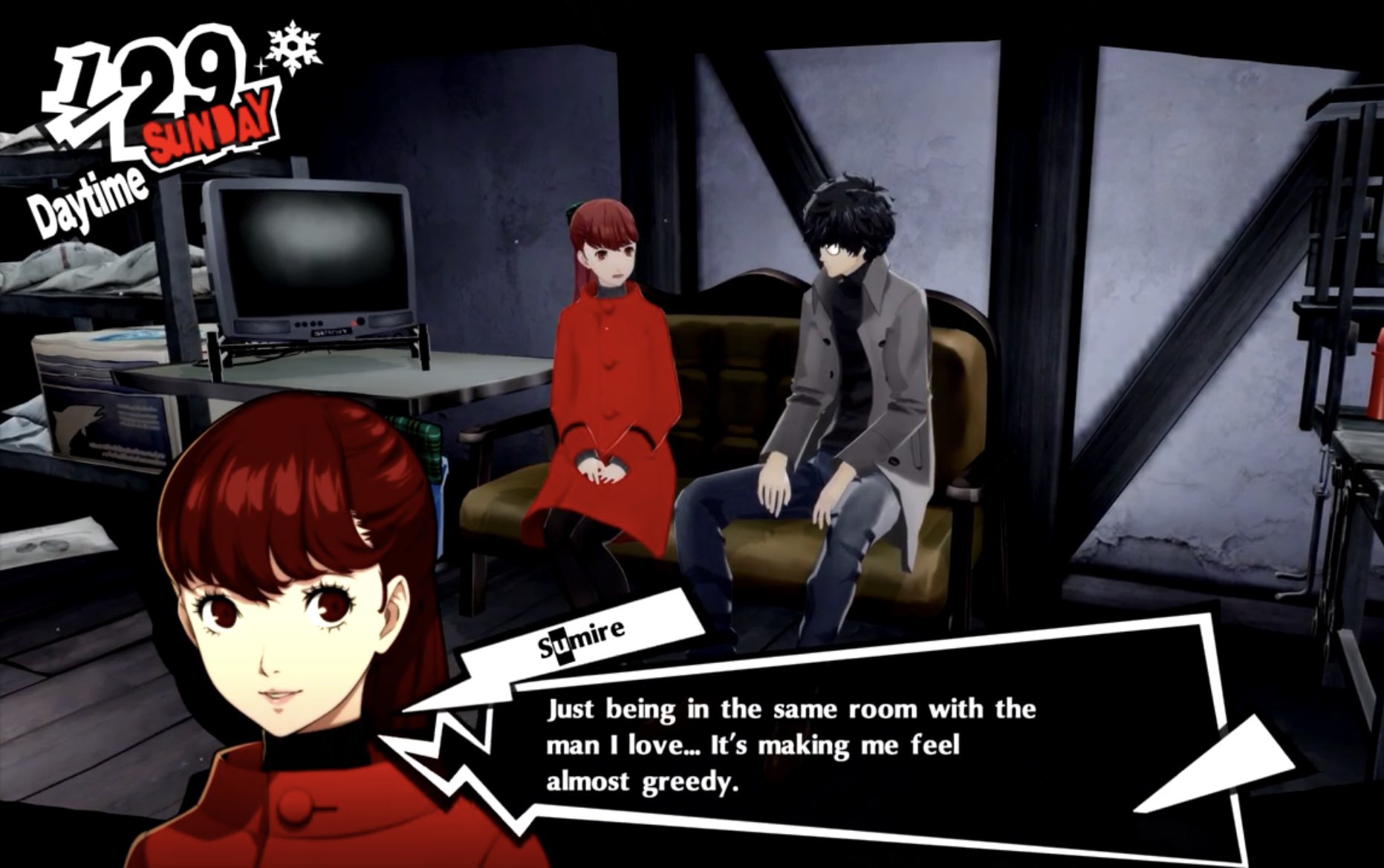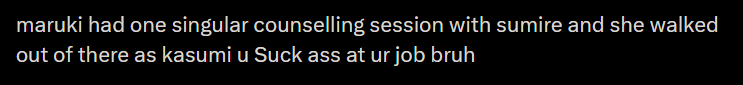 my friend spoiled herself in p5 royal. she got to the maruki palace intro after okumura palace, went to check the skills of sumire's persona and saw "next skill learned at 75" and was like "oh... she's not joining until the end of the game right? this is a tease"
