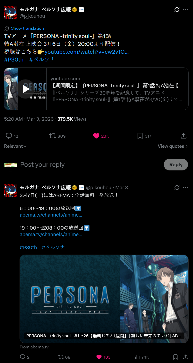 Previous >>558845463NEWS:>Persona 30th Anniversary Portal launched:https://p-ch.jp/p30th/https://www.youtube.com/watch?v=RvziRZn1PgM>Persona 4 Revival:https://p4re.jp/https://www.youtube.com/watch?v=Tcrb4s9ecd4GUIDES | ART, MUSIC, ETC. | STAGE PLAYS | PERSONA ISO | PERSONA CONCERTS>We have moved everything to one single document:https://docs.google.com/document/d/1xz0BdycMMVjWNDQ5TT1tbBZX25NqhK9a1mpsNDpq7gA/edit?usp=sharing>Birthday Calanderhttps://docs.google.com/spreadsheets/d/1aJmZvNgBOoA0LQNUWQPVNUnzgZzK0IoII_X-szdkAcc/edit?usp=sharing>The complete disc media archive https://disk.yandex.com/d/c1DdZHur2t1QpA/pg/ OC:>Draw Corner archivehttps://mega.nz/folder/9bhhiYRL#NCdz7s5xuXn_jIchU3KdcA>Anti Spammer Tech:https://arch.b4k.dev/vg/thread/464485803/#464508465#https://rentry_co/5sbcoavo