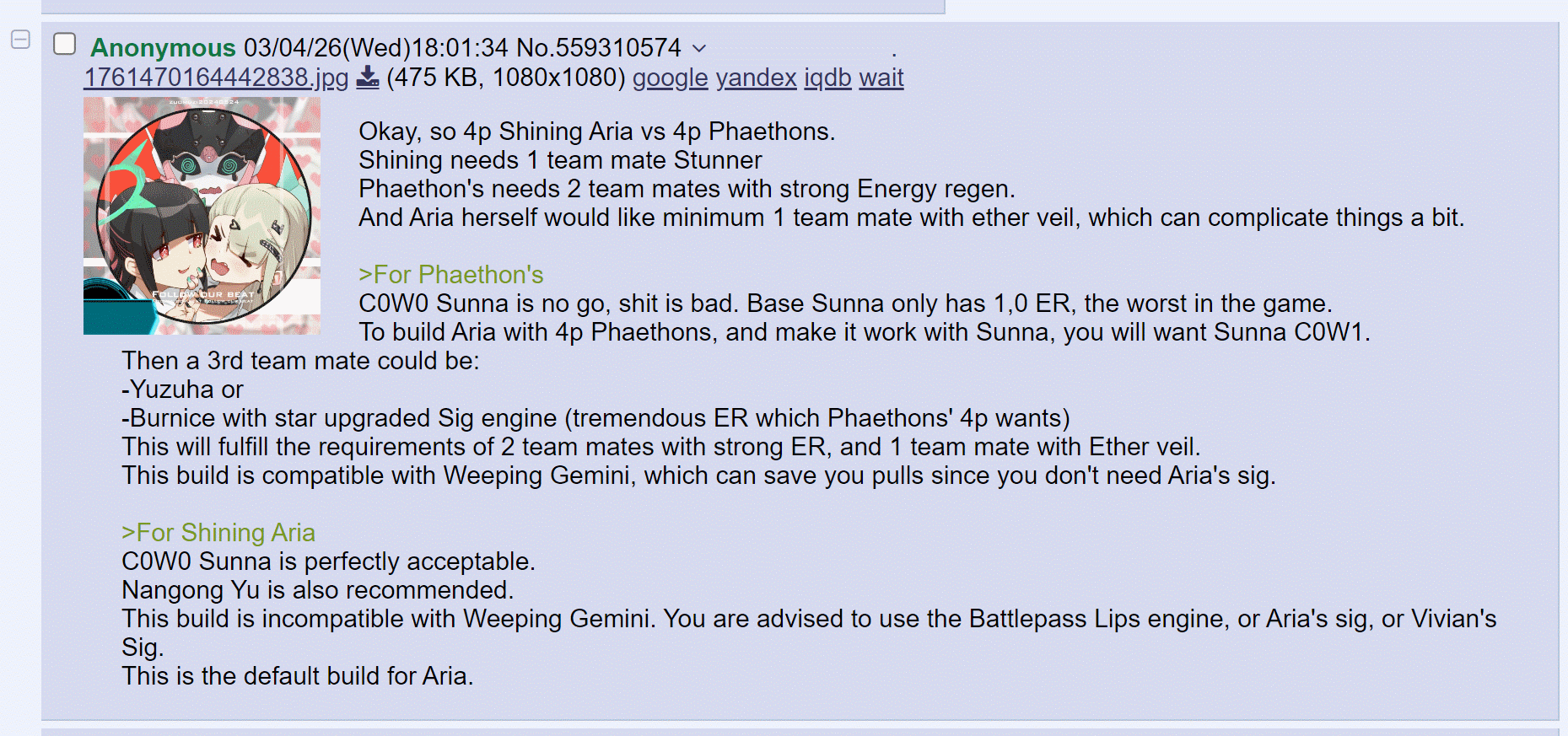 >>559312657Here you go, her engine + disc + team mates are all conditional on each other. Many dependencies.>>559312407>something doesnt add upFor example if you got lucky with Sunny by freak accident and won a cheap Sunna engine, while you tried Aria engine and lost the 25/75.The Phaethon's 4p opens up new possibilities for you.