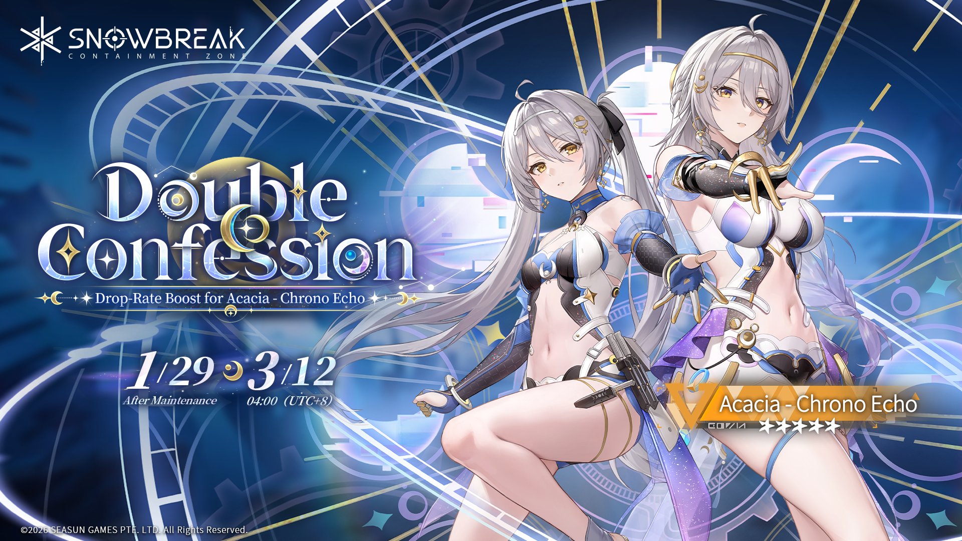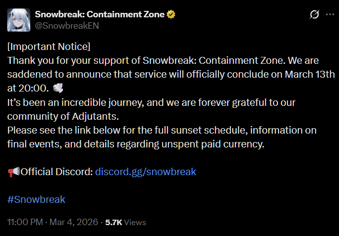 >Maintenance Noticehttps://x.com/SnowbreakEN/status/2028470386611089756>Decensor Guidehttps://rentry.org/begoneclouds>Trailers3.5 Trailer: https://www.youtube.com/watch?v=wkF3MLwlZ-03.5 Stream: https://www.youtube.com/watch?v=lF76XrT_YicAcacia - Chrono Echo Operative Trailer: https://www.youtube.com/watch?v=MoDOWs-FqeQMarian - Aquila Operative Trailer: https://www.youtube.com/watch?v=4p-rMmXV7jYASMR:https://x.com/SnowbreakJP/status/2022521178645238145https://x.com/SnowbreakEN/status/2022521180381458610>Newshttps://x.com/SnowbreakEN>PlatformsAndroid/iOSPC (Recommended): Standalone launcher, Steam, EGSDownload from main site: https://snowbreak.amazingseasun.com/>Current & Upcoming Events[Jan 29 - Mar 12] Expedited Access to Chapter 16 “Back from Bygone”[Jan 29 - Mar 12] Let’s Optimize, Heimdall![Feb 05 - Mar 12] Dono Duel[Feb 12 - Mar 12] Special Invitation (Claim Marian - Aquila for free)[Feb 12 - Mar 04] Starward Defense[Feb 16 - Mar 12] Heartfelt Messages[Feb 23 - Mar 09] Clash of Honor[Feb 26 - Mar 12] Hero Games>Current & Upcoming Banners[Jan 29 - Mar 12] Acacia - Chrono Echo | Moonwake Blade[Jan 29 - Mar 12] Banner Selector 1 (Choose one of Chenxing - Ethereal Cloud, Cherno - Enigma, Katya - Dawnwing and Vidya - Celestial Swan)[Jan 29 - Mar 12] Banner Selector 2 (Choose two of Lyfe - Infinite Sight, Fenny - Starshine, Chenxing - Jade Arc, Yao - Nightglow, Enya - Tempest, Katya - Rhapsody and Tess - Phantasia)[Feb 12 - Mar 12] Marian - Aquila | Core Prism[Feb 19 - Mar 12] Fenny - Pureheart | Welkin Starflare[Feb 19 - Mar 12] Siris - Freefin | Splash Glider>Codes (Redeem in [Settings > Other])followusACACIAEXPUPMARIANNIGHTPULSINGLOVE>/snowg/ Resource Pastebinhttps://rentry.org/snowg-resources>100 Pity Banner Type Detailshttps://rentry.org/snoblerate>/snowg/ Friends Formhttps://forms.gle/QaJ8N1x3MPo2JPKL7https://docs.google.com/spreadsheets/d/18uvxL8bqODpq0AxdzDE_0ho9FSs4P4fyecM Ut6ndQfM/Previous: >>559261769