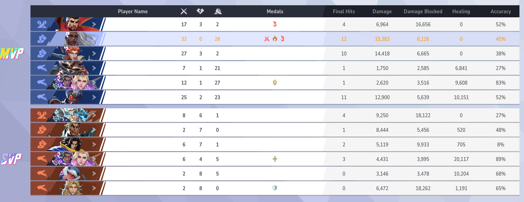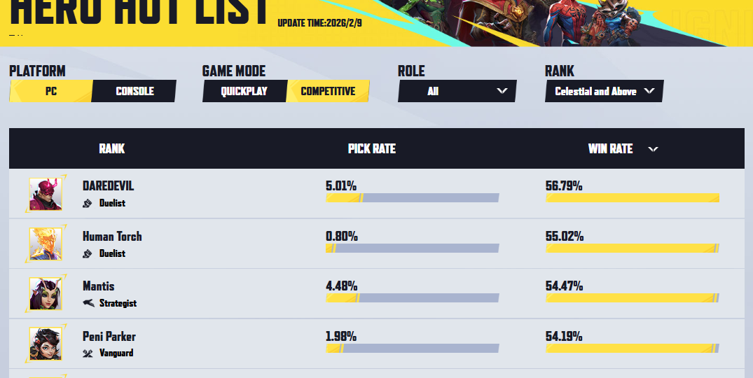 >>559354303Peni's winrate puts her in the top 5, but it's only 54%. Starting with Human Torch at no. 2 with 55%, there are 9 heroes (including Peni) down to Tankpool at 53%. With such close percentages, these heroes are more or less interchangeable in regards to their placement. Additionally, Peni in particular has a low pickrate, which could allow for the possibility that her winrate is slightly inflated due to being played by one-tricks and/or in specific situations or maps that she is strong at. I believe she is strong, but not overpowered.Mantis is strong, and whilst I doubt she is overpowered, her high winrate without the low pickrate that Peni has is indicative that it may be worth considering a minor nerf.Captain America is at 18th and Storm is at 31. The former seems to be fairly balanced and given the latter's slightly negative winrate combined with a very low pickrate she could possibly be buffed, though the fact that she is a flyer and thus vulnerable to poke type characters, of which both Hela and Phoenix are highly picked characters with higher winrates, I would be more likely to consider an adjustment to other characters first.