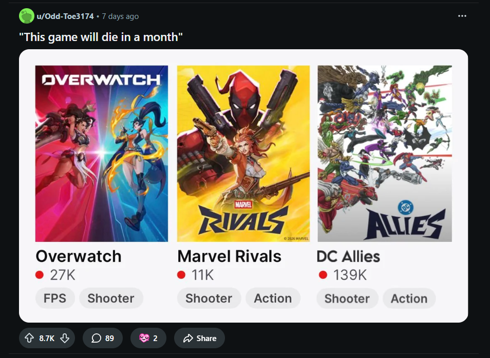 >>559351121if Blizzard kept Overwatch on life support for this long, i don't see Marvel Rivals dying any time in the next 10 years.