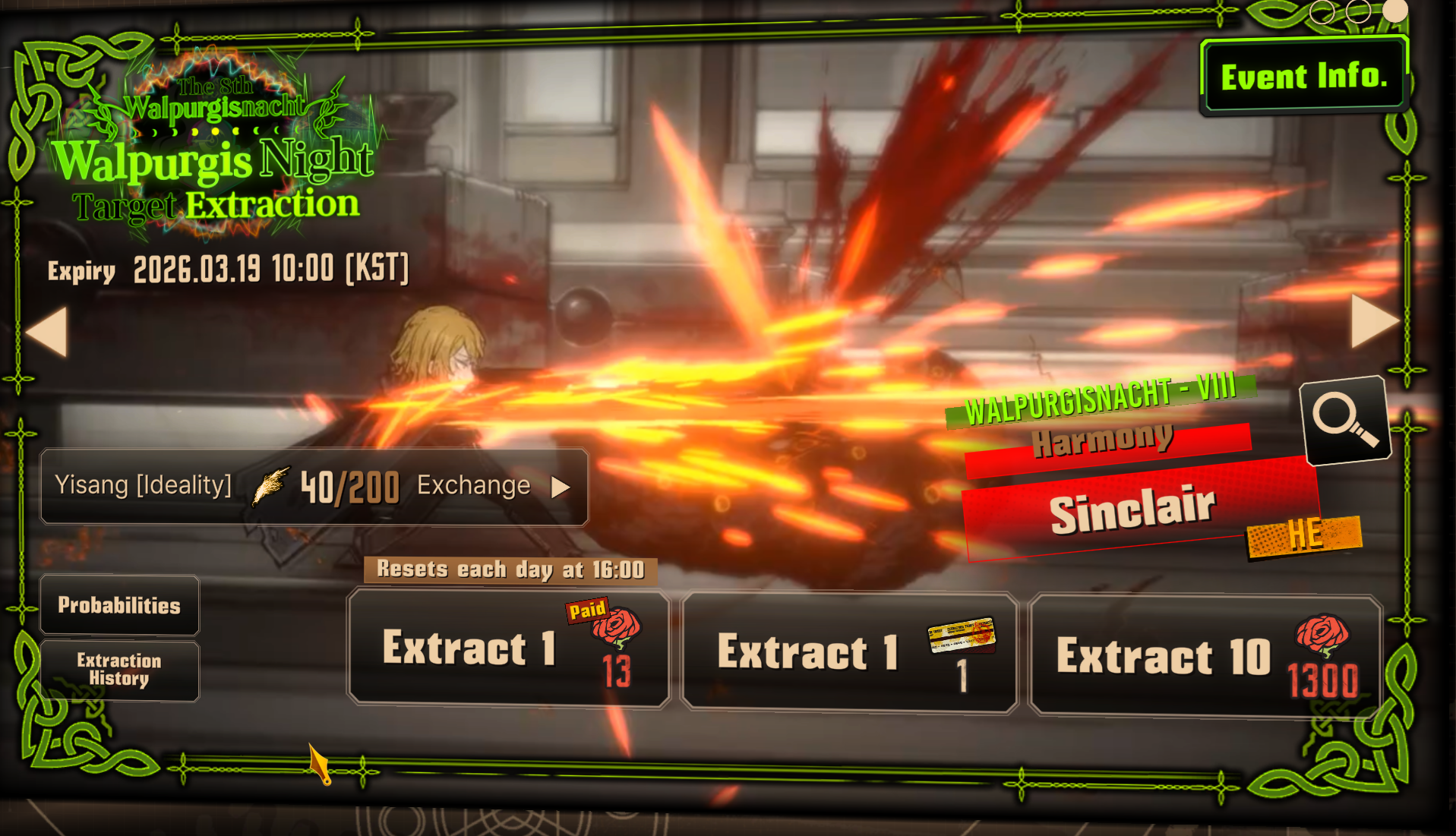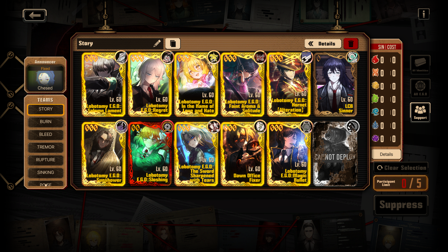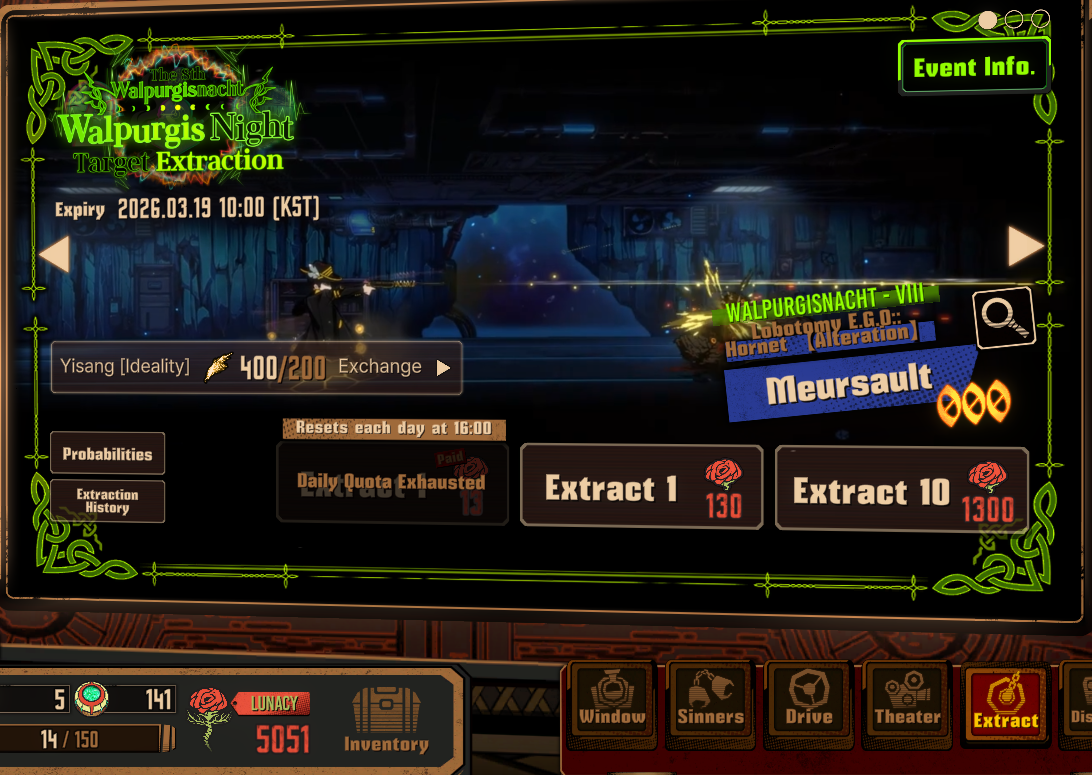 Previous thread: >>559320608Season 7 - Kumo no Ito2025.12.31 — Mirror Dungeon #7 - Mirror of Names and Spiders2026.02.19 —Refraction Railway Line 5 - Merry Go Round2025.02.20 —>Current EventsThe 8th Walpurgis Night - The Dusk of Amber2026.03.05 — 2026.03.193rd Anniversary Event2026. 2. 26 12:00 — 2026. 3. 26 10:00 (KST)>Current Extractions2026.03.05 — 2026.03.19[000] Lobotomy E.G.O::Hornet [Alteration] Meursault[000] Lobotomy E.G.O::Faint Aroma & Solitude Ryoshu[HE] Harmony Sinclair2026.03.05 — 2026.03.19Target Extraction: [ The 3rd & 4th Walpurgis Night BokGak ]>FAQs! This game is directly tied to the setting of Project Moon's previous games, Lobotomy Corporation and Library of Ruina, and is set after both. Expect spoilers for those games in this thread.! The tutorial is important.>Download linksAppStore: https://apps.apple.com/app/limbus-company/id6444112366Google Play: https://play.google.com/store/apps/details?id=com.ProjectMoon.LimbusCompanySteam: https://store.steampowered.com/app/1973530/Limbus_Company/>Other linksOfficial twitter: https://twitter.com/limbuscompany_bOfficial youtube: https://www.youtube.com/@ProjectMoonOfficialOfficial site: https://limbuscompany.global>Required readinghttps://mega.nz/folder/xosDkZ5Z#Wt4JpUt5Bb2XG77pxuuXpw>For all your EGO and Sinner info needshttps://limbus.kusoge.xyz/https://gll-fun.com/en/>Useful resources and a general guidehttps://rentry.org/lcg_resourceshttps://rentry.org/lcbguidehttps://rentry.org/LCB_optimal_grind_guidehttps://lcb-days-since-last-id.carrd.co/https://lcb-days-since-last-ego.carrd.co/>Countdownhttps://lcbcountdown.carrd.co/3rd Anniversary Animationhttps://youtu.be/NtvbDGnRT-g?