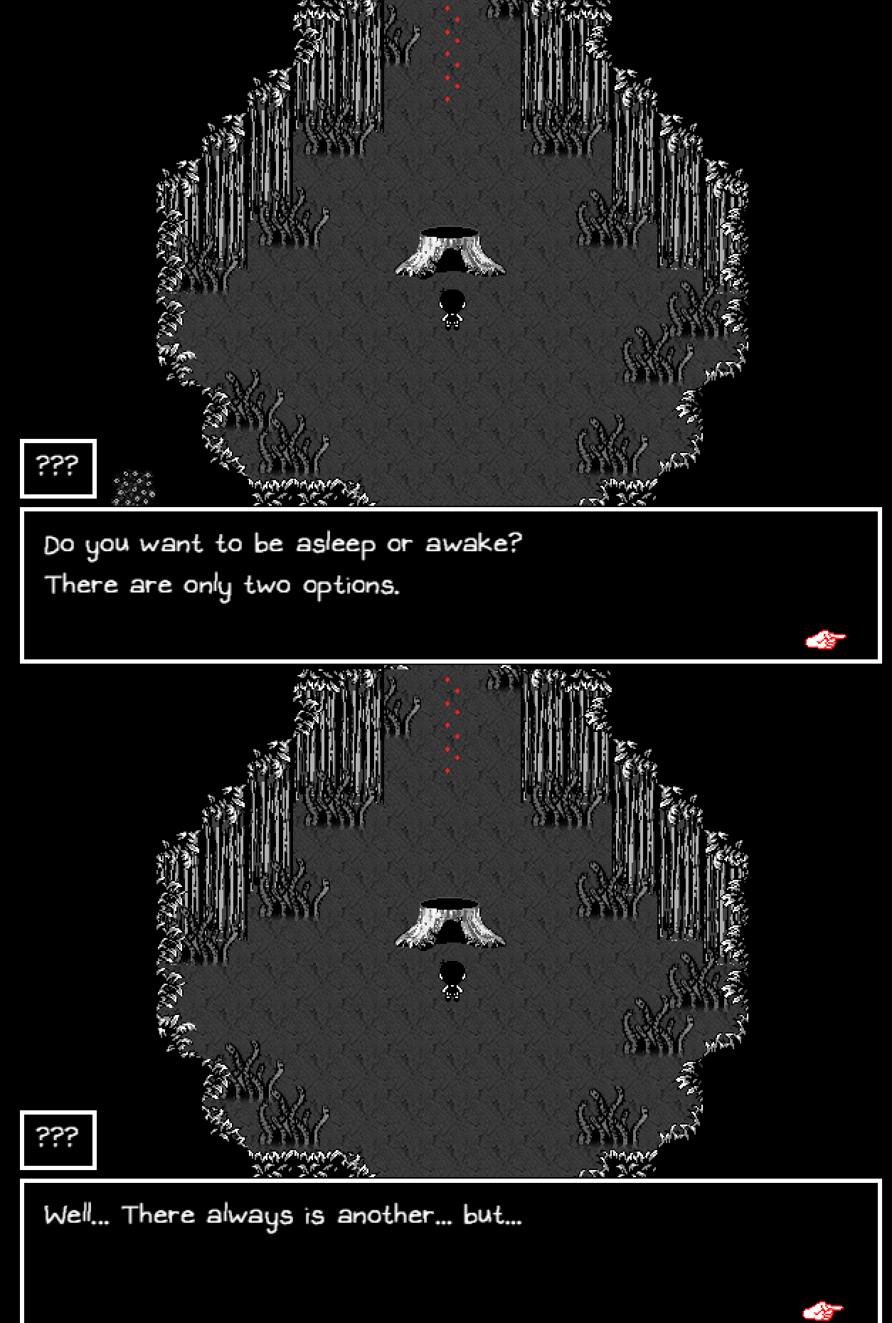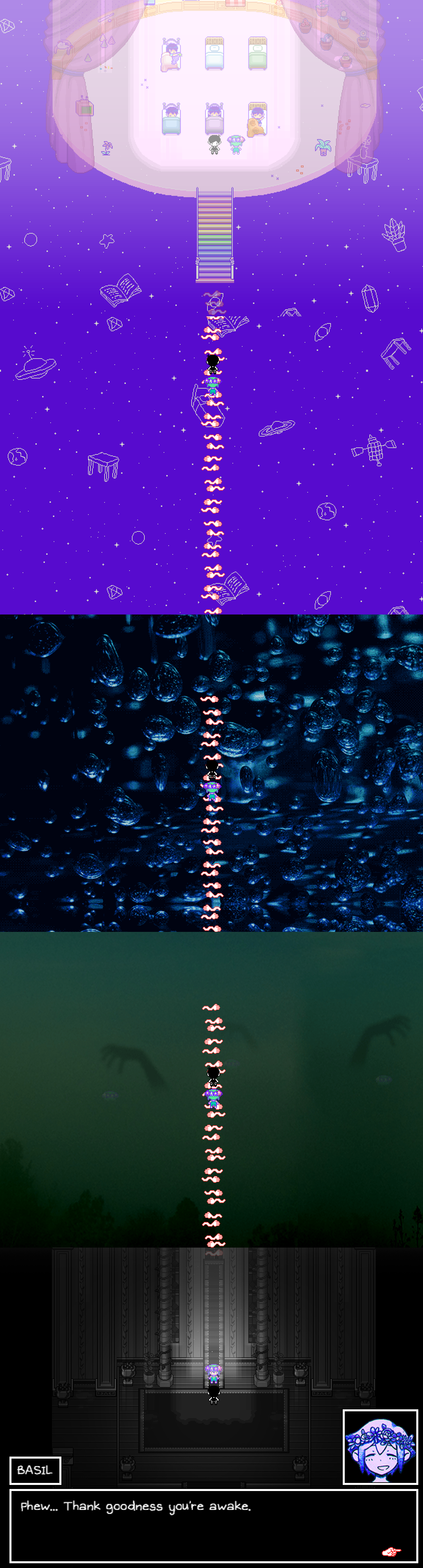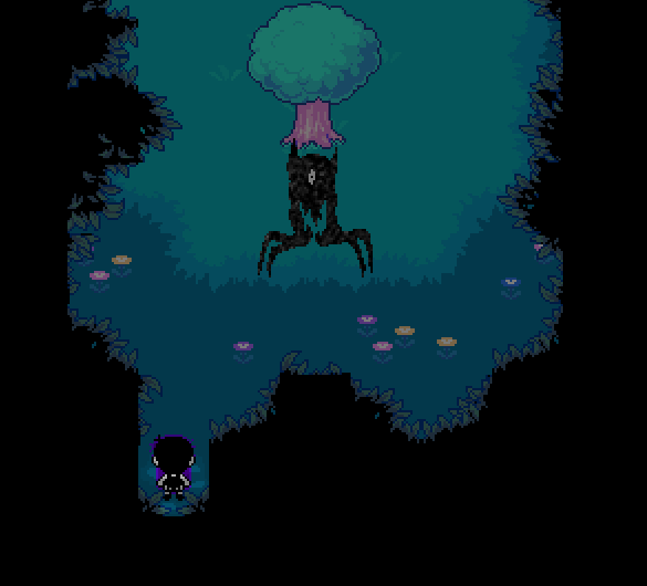 Well this is new to me. Taking the raft two extra times next to Bagel's headless corpse took me here. I swore I remembered it was just supposed to summon a Something enemy to fight. Didn't know about this room.I guess this was always here and I just didn't know how to get to it on Sunny Route?