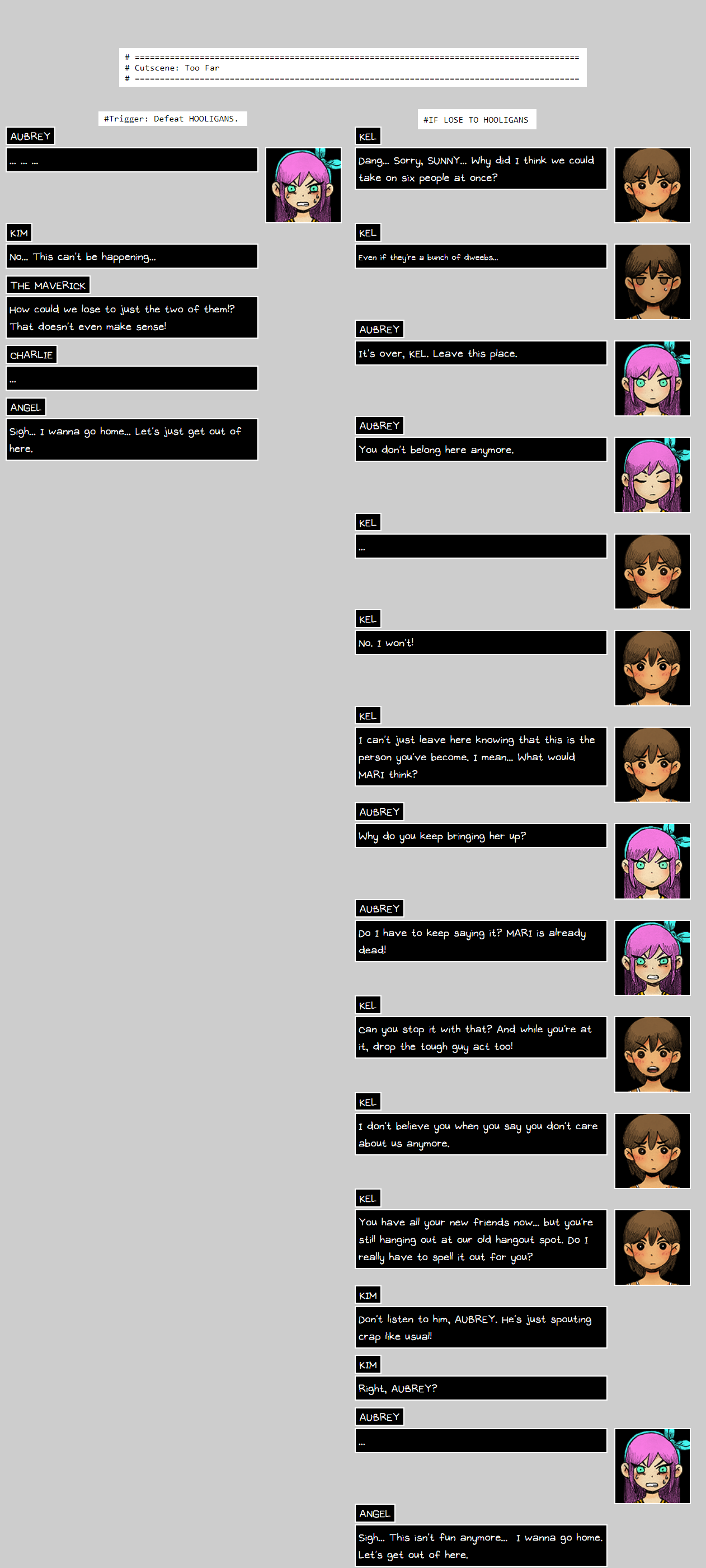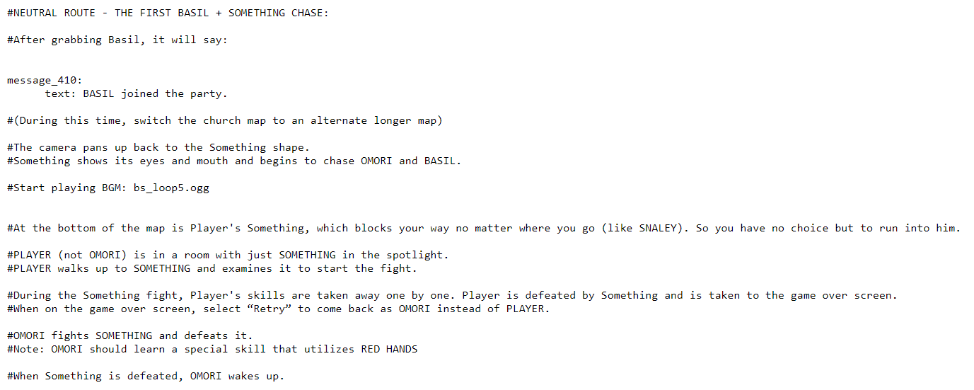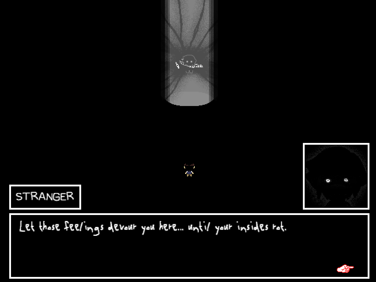 >>559380230Don't worry, the Weathervane room can be gotten back to.>>559380319Stranger sure changes his tune when Omori doesn't do what he wants. It's a heavy moment.I've mentioned this before, but it's relevant again and one of my favorite bits of known unused Omori content. There's leftover data to imply that you were actually going to fight Something instead of Stranger at this point of Hikikomori. Dev text in the language files even reference how it would play out.There's two unused battles that can be called in which related to this and still somewhat function. A fight as Sunny against Something which plays out a lot like this very Stranger battle. https://files.catbox.moe/s8iiqm.mp4And then a fight against Something which plays out as the dev text explains.https://files.catbox.moe/igc2l4.mp4It's still interesting to me even if this has been known for a while. Omori sure went through one hell of a dev cycle.