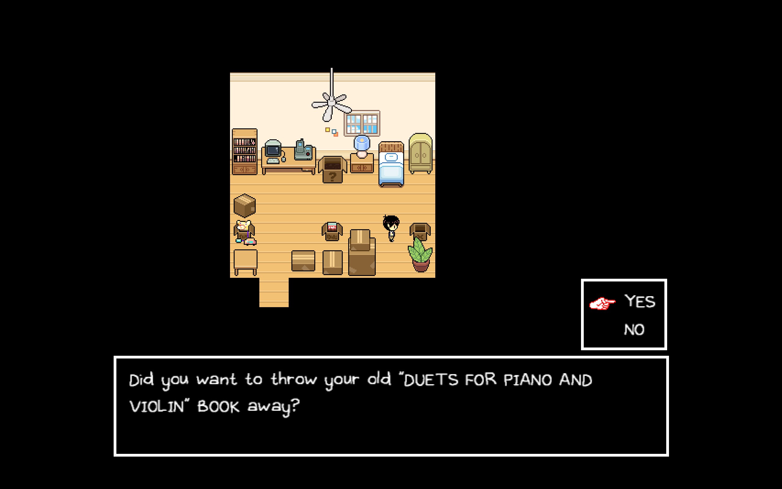 He's lost it at last.I was not expecting to get sadder over the fucking sorting task minigame. Somehow irl even as I know I will never look at something again, I keep it around, just because I can't bear to throw it away and just forget about it (as opposed to have it clutter someplace and forget anyways). And as in real life I kept just about everything, knowing damn well it's mostly just scraps that will serve no purpose to Sunny. I threw out the Sweetheart doll though.The faint "Playing Forever" (I think that is the track) playing as Sunny prepares to return to bed and dive back into Headspace one last time doesn't help. It's like it calls to him, like the fuckin Green Goblin mask.