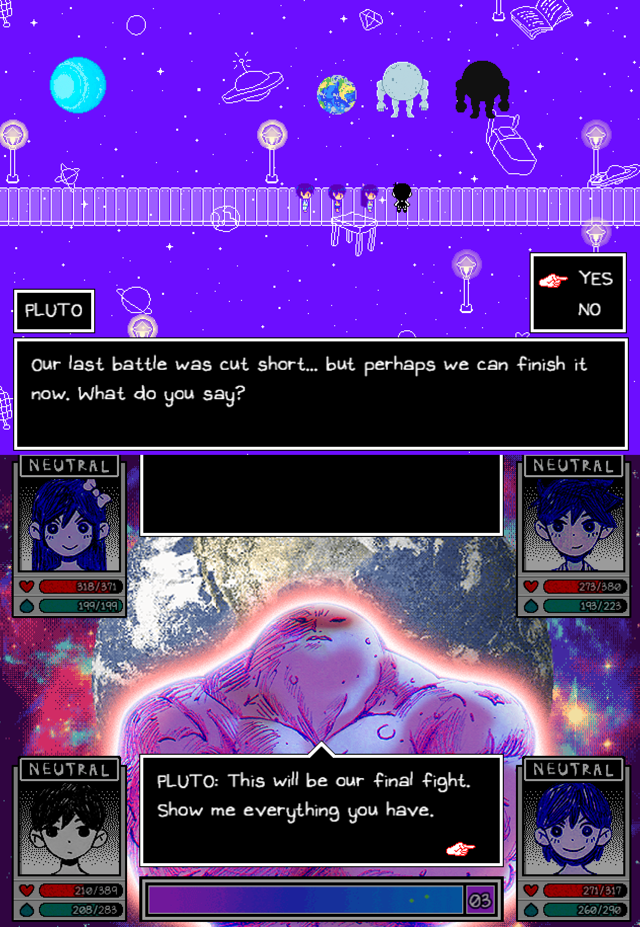 Okay, second time was the charm.It looks like Pluto actually just fucking maxes out his stats in preparation for the attack, taking two turns to buff himself. Emotion advantage plus Stare, Power Hit, Rubber Band, and a Kel Nuke salvaged the last attempt on the turn before it hit.Using Sad+Happy advantage at the beginning while focus firing The Earth first also helped a lot.